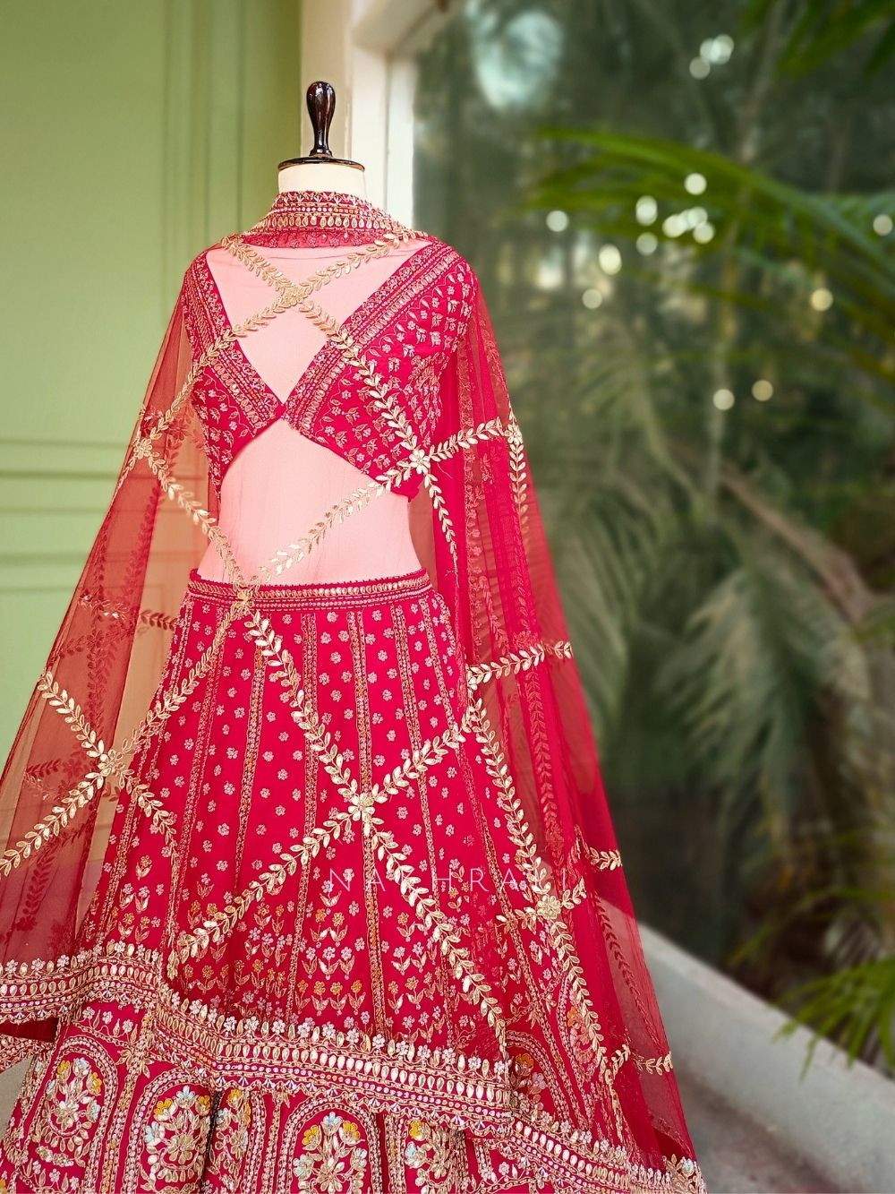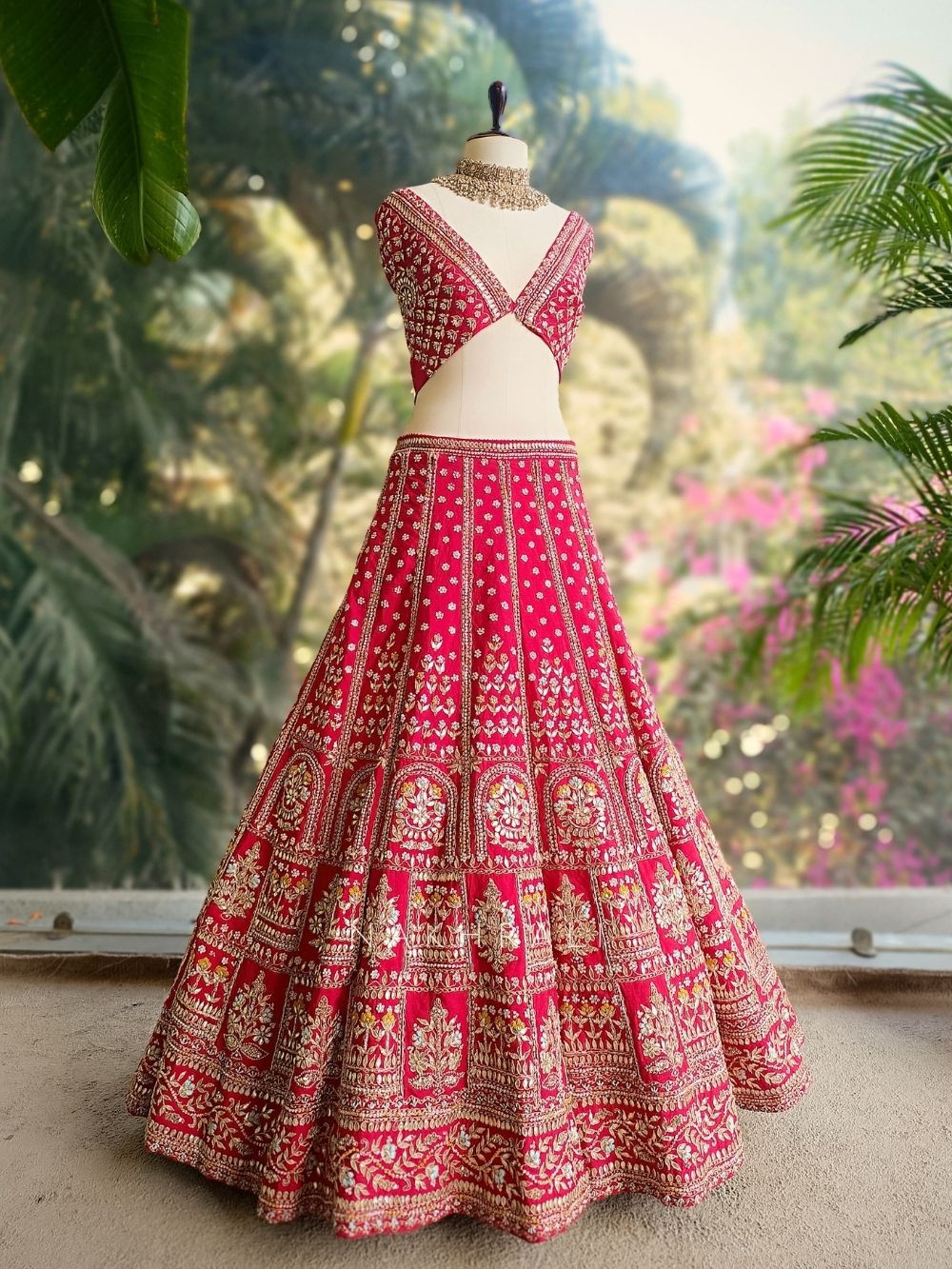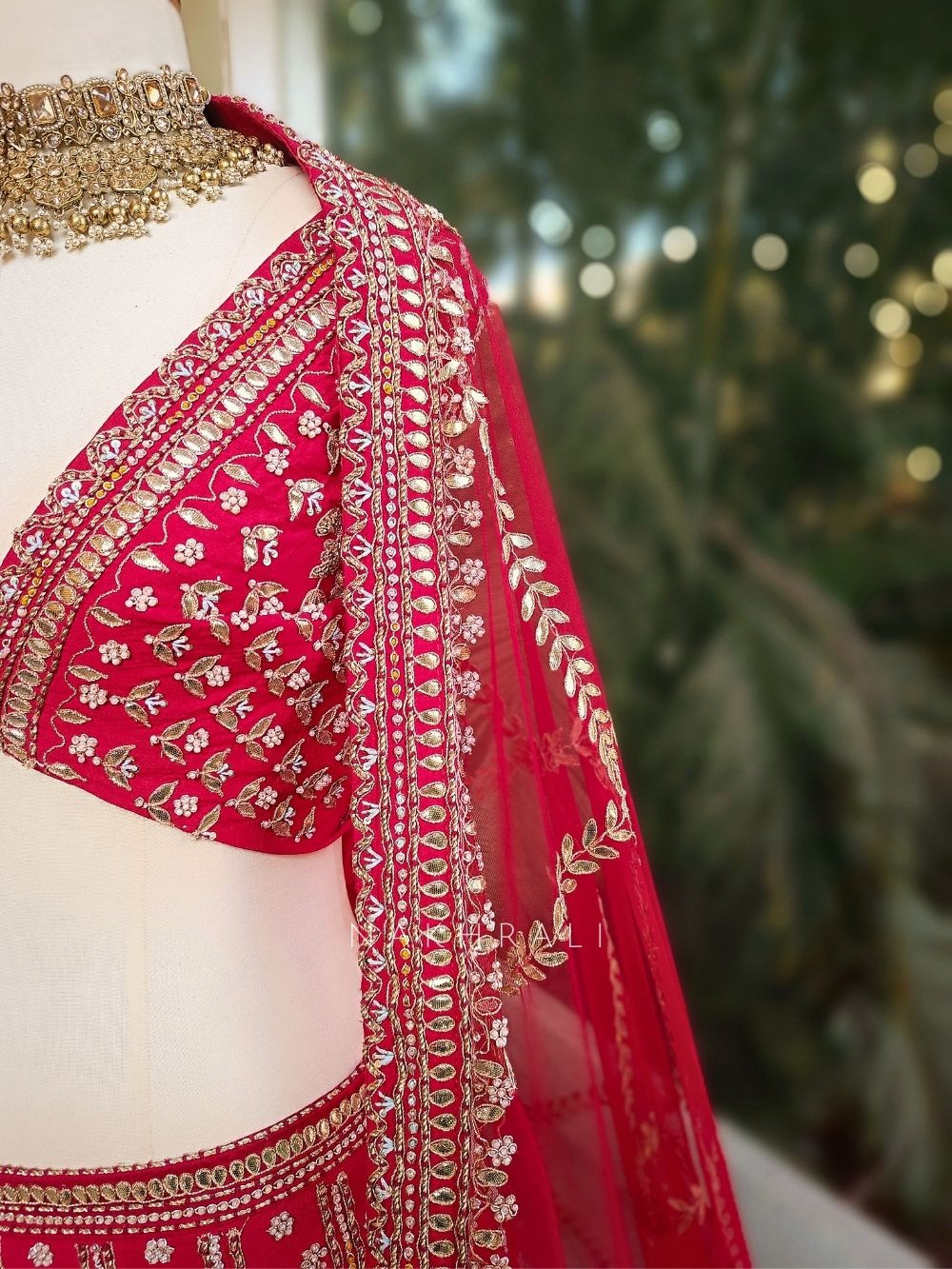 "Step into royal elegance with our Ruby Royale Unstitched Bridal Lehenga. This exquisite red ensemble, adorned with intricate details, embodies timeless beauty and grandeur, perfect for the bride who dreams of a majestic wedding day."