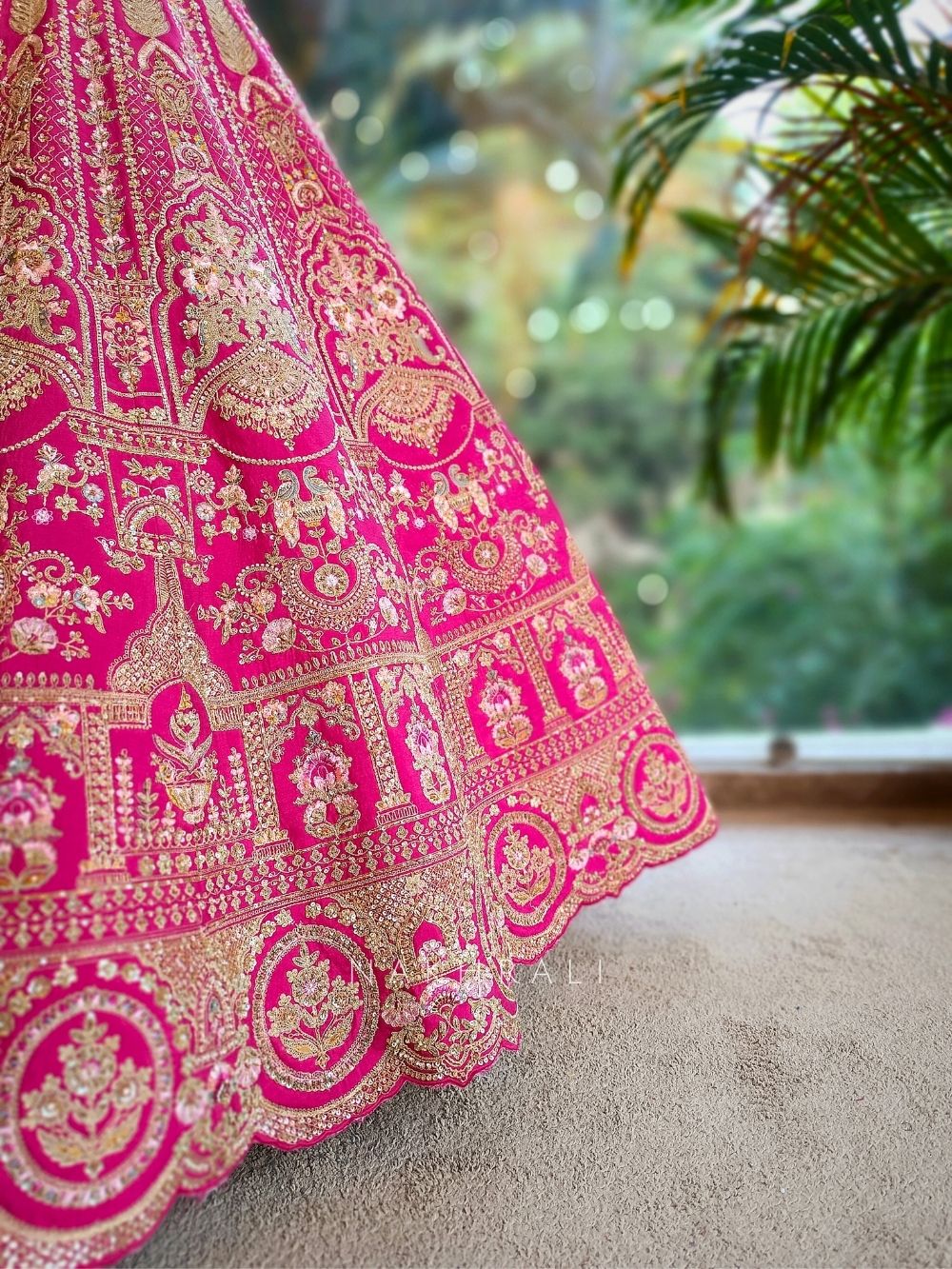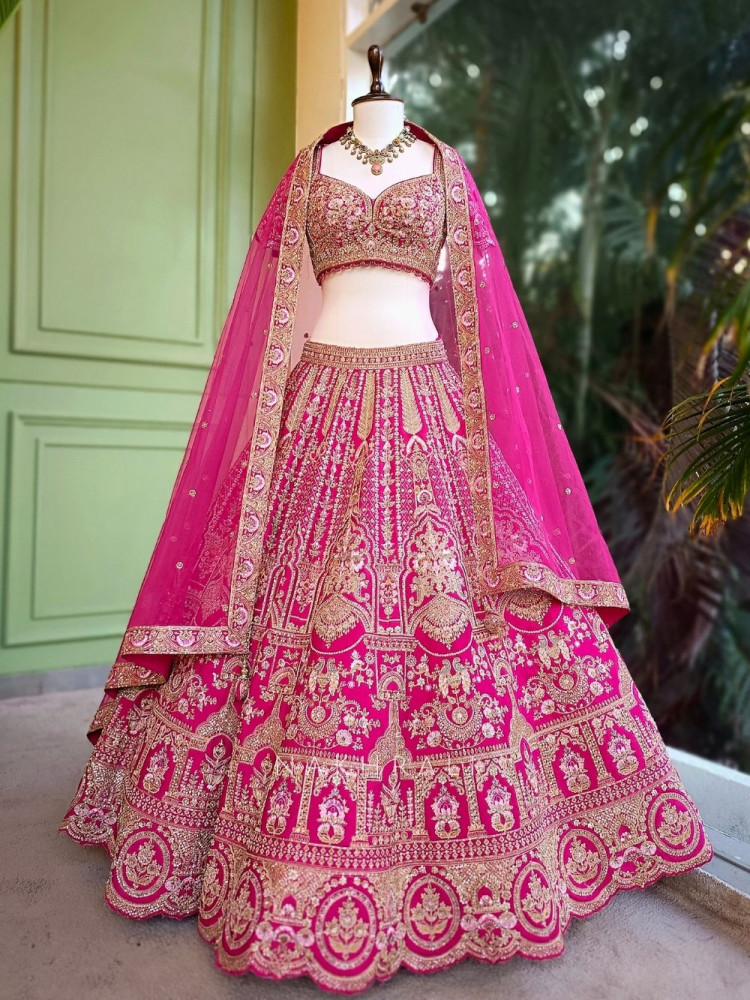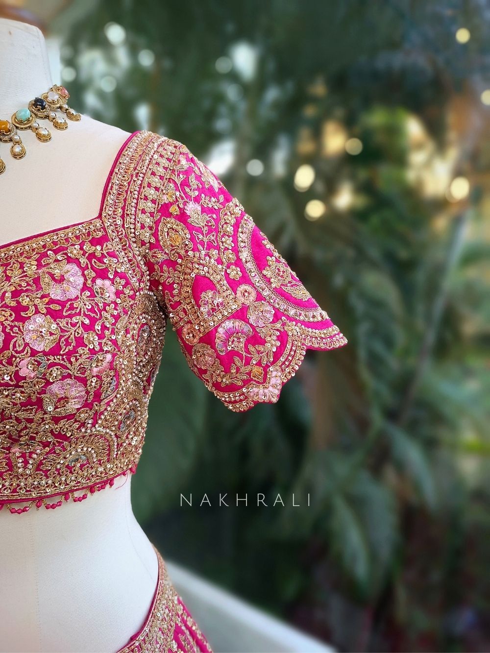 Step into your big day with timeless elegance in our Rudrabha Magenta Bridal Lehenga. Designed for the bride who loves grandeur, this masterpiece showcases intricate zari embroidery and sequin embellishments across the flared skirt, radiating a royal charm with every step. The blouse features rich detailing and short sleeves with elaborate embroidery, ensuring a statement bridal silhouette. The sheer dupatta with a beautifully embroidered border completes the ensemble, balancing grace and luxury. Perfect for weddings and receptions, this lehenga embodies tradition while offering a modern regal appeal.