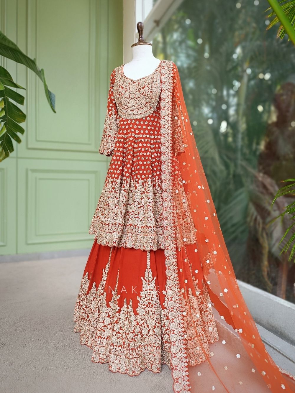This grand lehenga set showcases intricate Mughal floral jaal embroidery enriched with mirror and stone embellishments throughout. The blouse features dense neckline detailing with a deep back and dori tie-up, while the flared lehenga carries heavy border embroidery finished with scalloped edges. The matching dupatta is adorned with embroidered butis and an ornate border, creating a regal silhouette perfect for wedding celebrations and statement festive occasions.