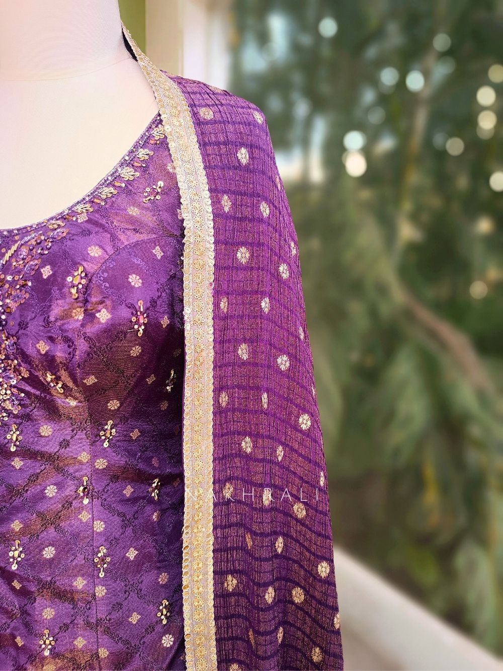 This purple kurta lehenga set is crafted for refined celebrations where elegance matters more than excess. The kurta-style blouse features intricate embroidery concentrated around the neckline and bodice, balanced with subtle motifs across the fabric. It is paired with a fluid, finely pleated lehenga skirt highlighted with woven butis and an ornate border that adds depth without overpowering the look. The matching dupatta completes the ensemble with delicate detailing and a soft fall, making this set ideal for festive gatherings, wedding functions, and evening celebrations where grace takes priority.