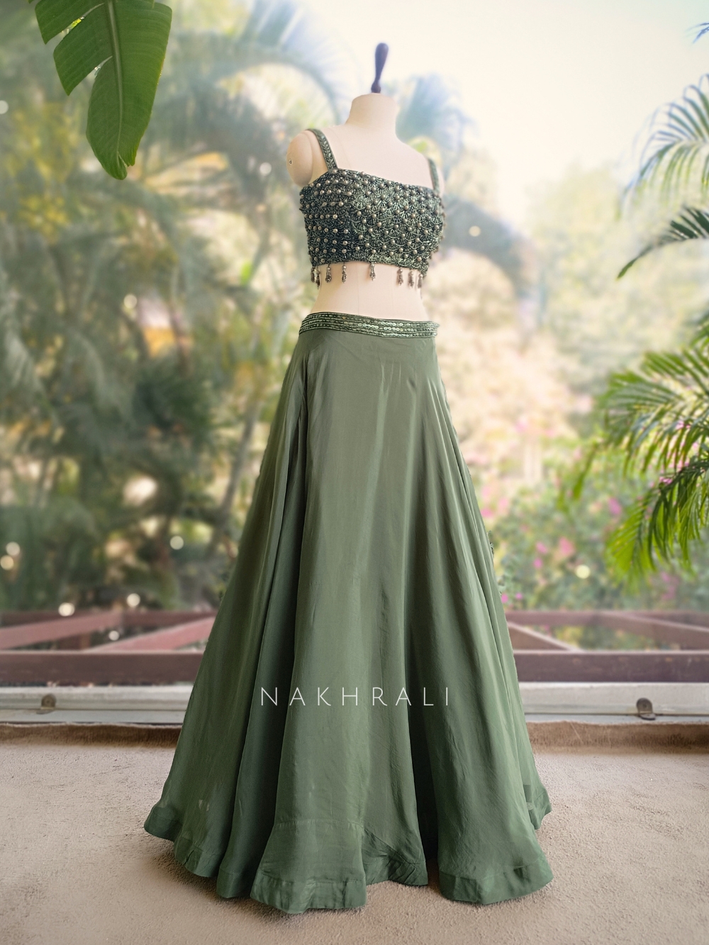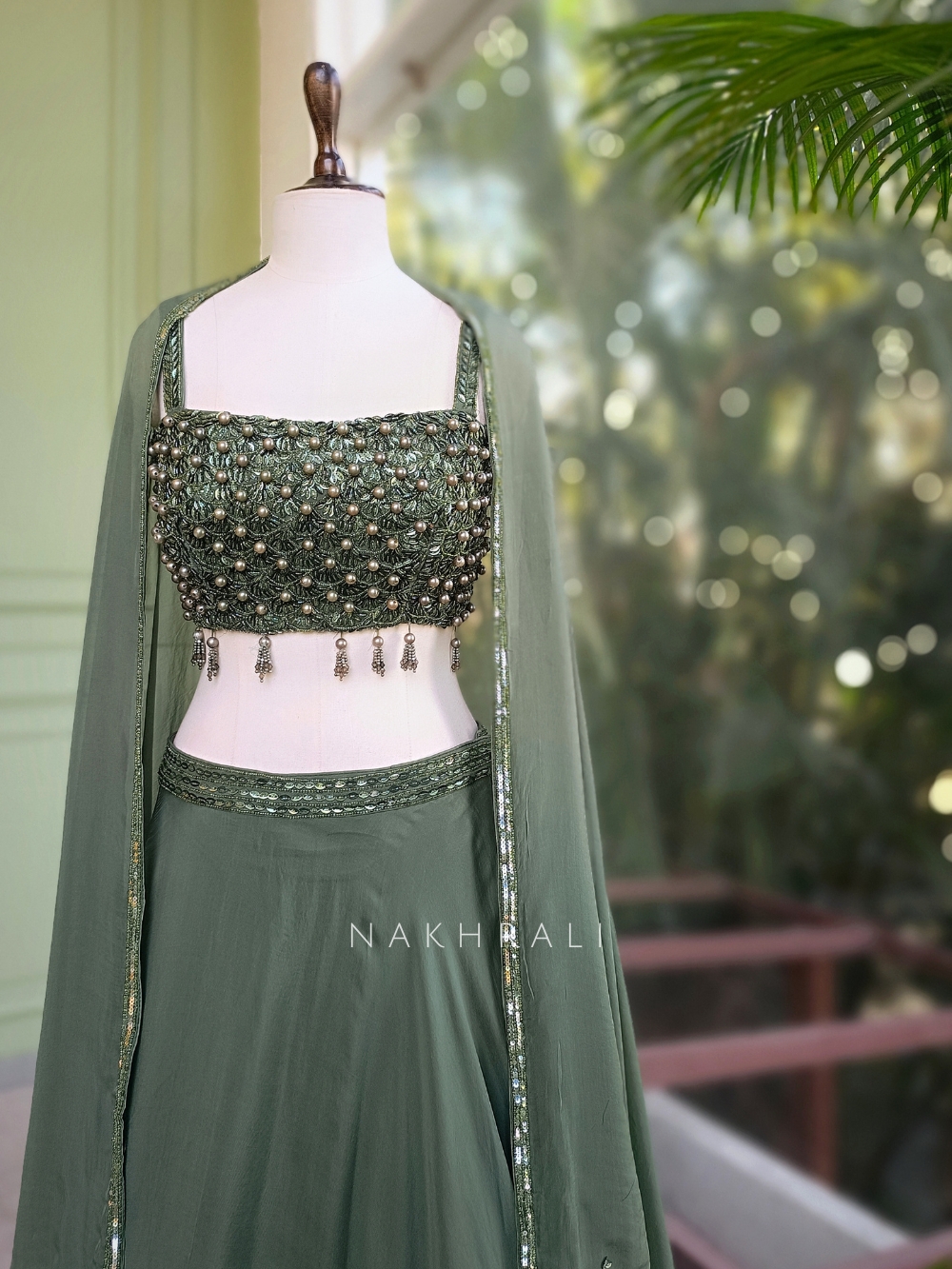 This sage green indo western lehenga is designed for modern elegance with a strong focus on texture and detail. The blouse is intricately embellished with pearls, beads, and sequins, creating a rich, dimensional surface that instantly elevates the look. Delicate hanging accents add subtle movement, making the blouse the standout feature of the ensemble. The lehenga skirt is kept fluid and minimal, allowing the embellishment to take center stage, while a finely detailed sequin waistband adds a refined touch of shimmer. Paired with a soft, sheer dupatta finished with a sequin-embellished border, the overall look balances structure with effortless drape. Ideal for cocktail evenings, engagement functions, and contemporary festive occasions, this piece is perfect for those who prefer understated silhouettes with impactful detailing.