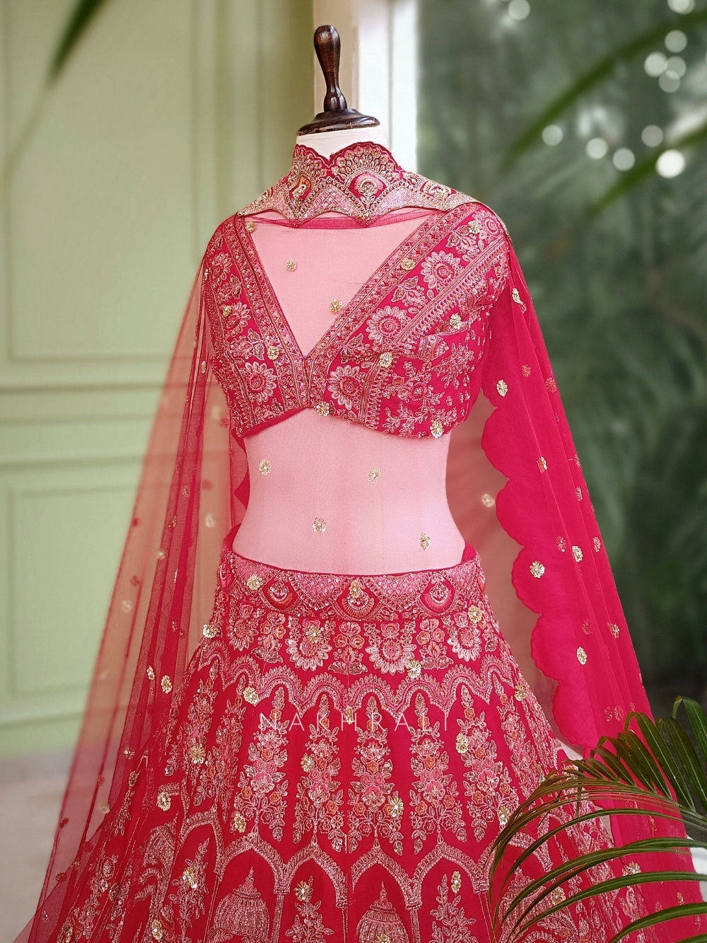 The Samriddhi Red Bridal Lehenga is a celebration of grandeur and heritage. Featuring a two-layered design, this unstitched masterpiece is richly embroidered with zari, sequin, and stone detailing. The intricate traditional motifs narrate stories of royalty and artistry, while the bold red hue adds unmatched bridal charm. Perfect for wedding ceremonies and regal celebrations, it exudes sophistication, grace, and legacy — a true reflection of the Nakhrali bride’s elegance and strength.
