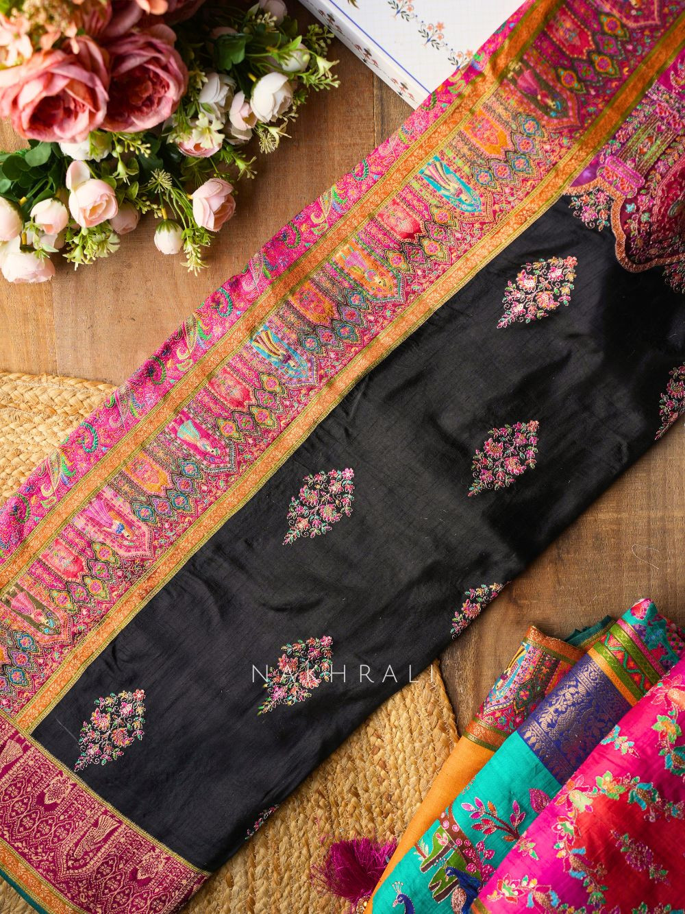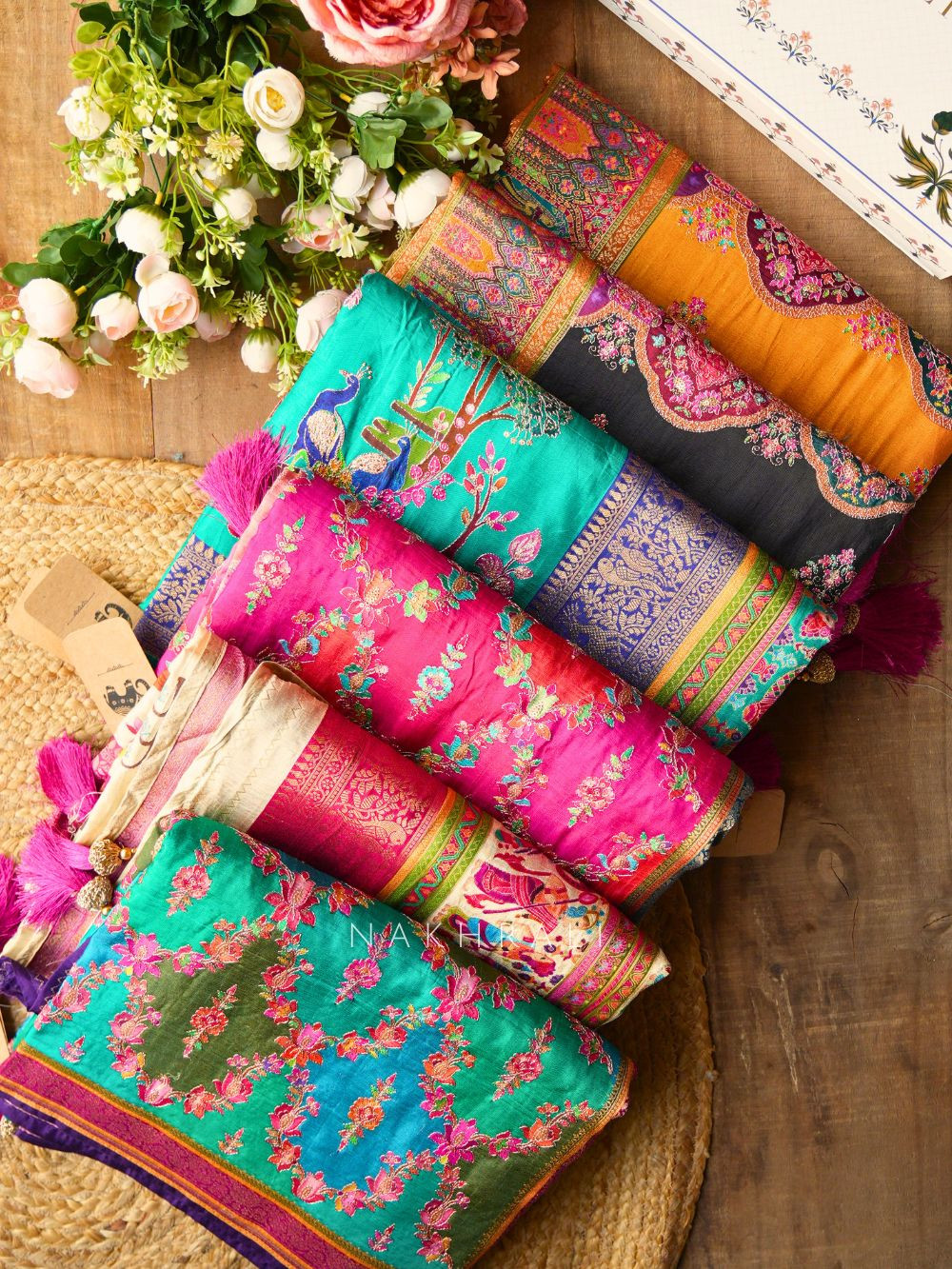 Sarovar is a saree that highlights craftsmanship through woven detailing rather than surface printing. The saree features finely woven motifs spread across the body, forming graceful patterns that are integrated into the weave itself. Each colour variation carries its own visual character, enhanced by a contrasting traditional border that adds structure and depth to the drape. Select designs include narrative-inspired woven elements and floral forms, giving the saree a distinctive ethnic appeal. It comes with a matching unstitched blouse piece attached to the saree, allowing it to be stitched in the preferred style. Designed for festive days, cultural gatherings, and traditional occasions, Sarovar offers richness without heaviness.