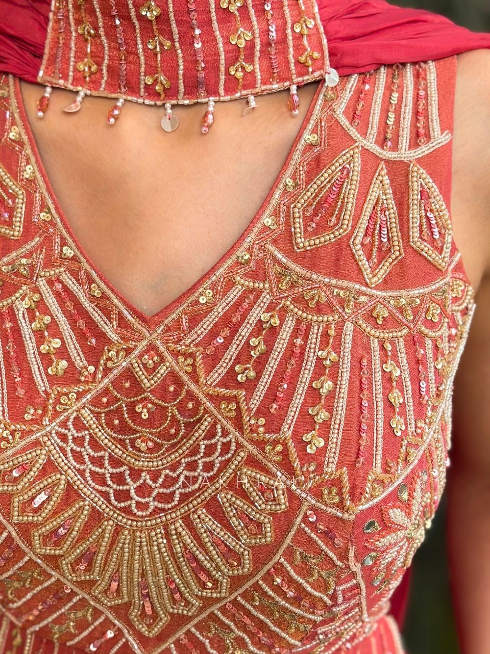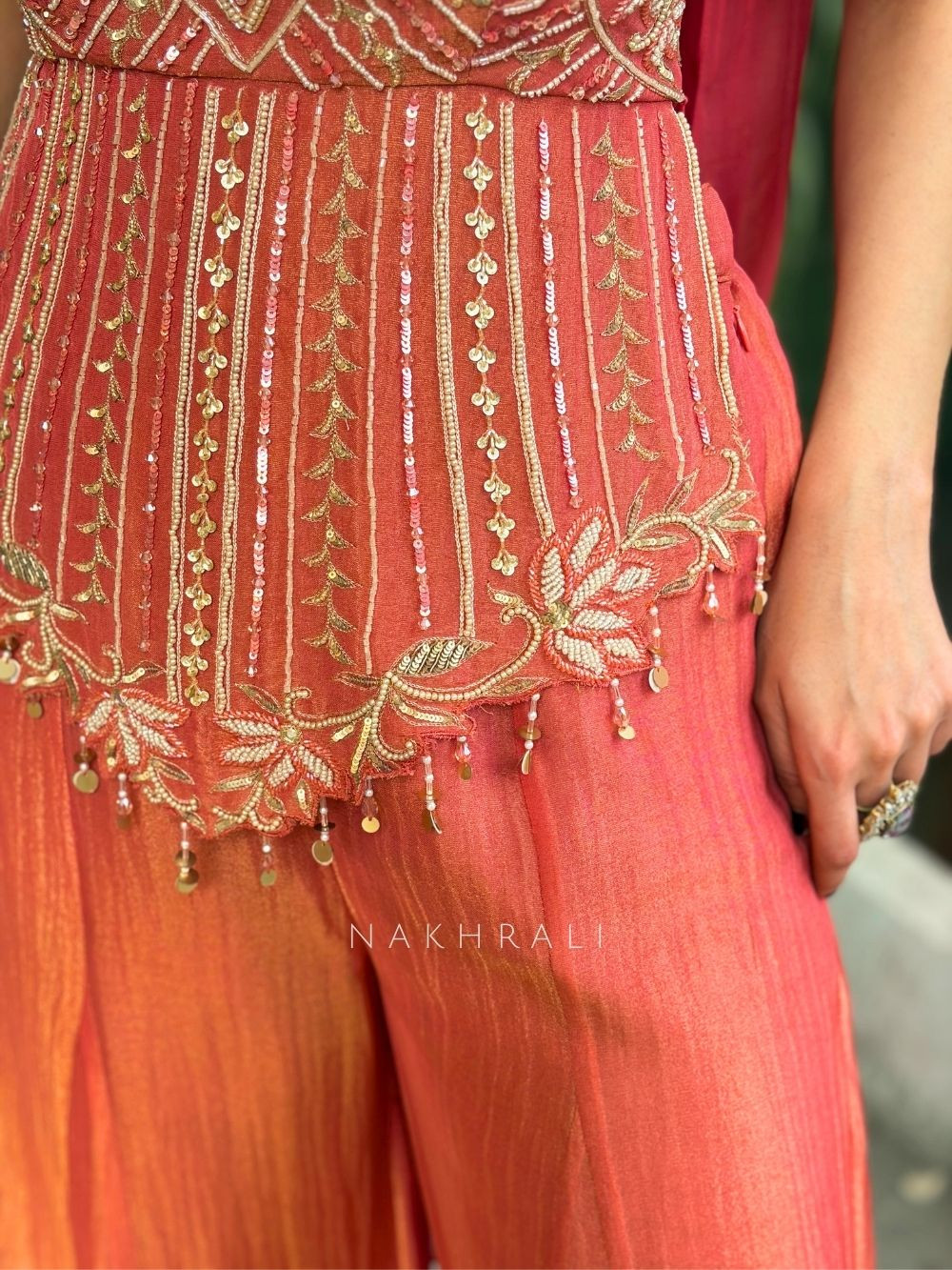 This crop top palazzo set is designed to make a refined festive statement. The sleeveless V-neck crop top is richly adorned with detailed gold embroidery, sequin accents, and delicate bead embellishments that highlight the neckline and hem. Paired with fluid palazzo pants that offer graceful movement and comfort, the set is completed with a coordinated choker-style dupatta featuring matching embroidery and hanging bead details. Ideal for festive gatherings, mehendi functions, and intimate celebrations, this ensemble balances ornate craftsmanship with a contemporary silhouette.