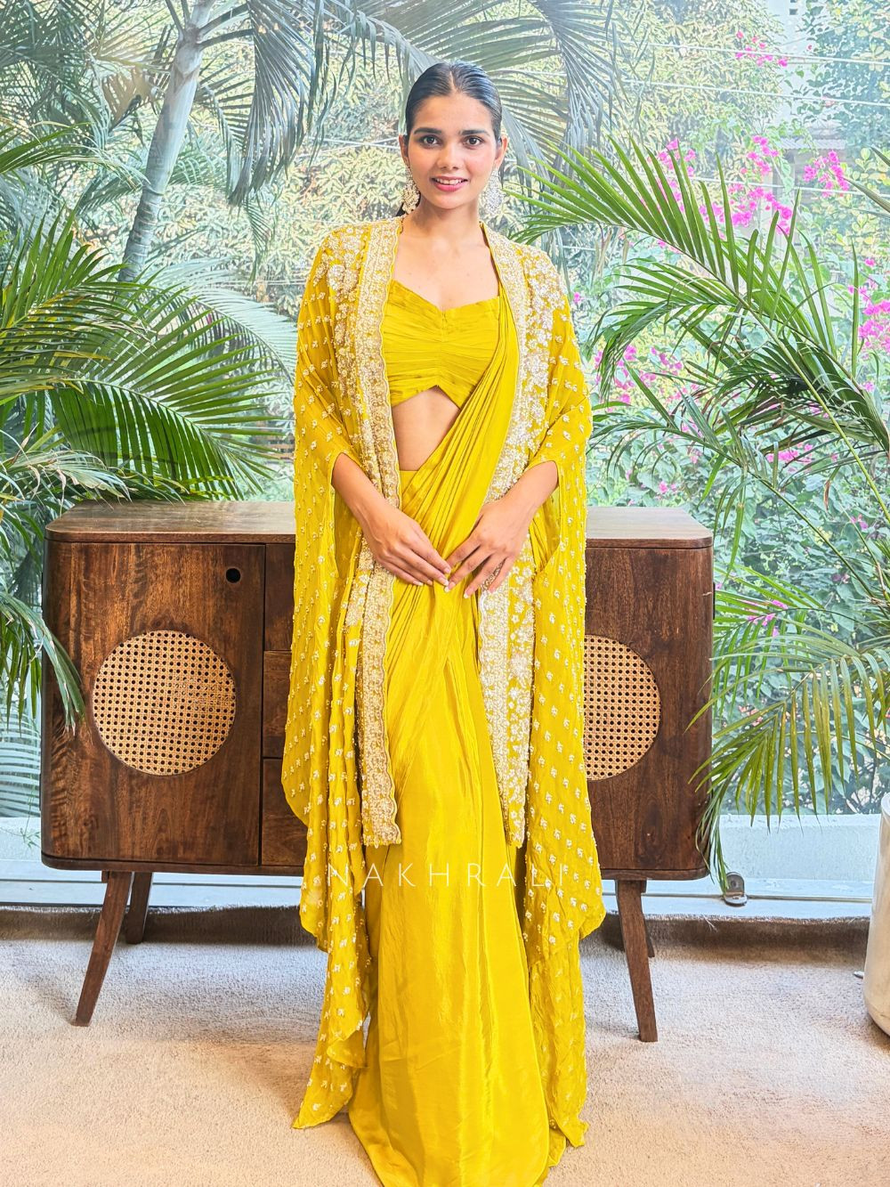 This designer drape saree blends comfort with contemporary glamour, featuring a pre-stitched silhouette that allows easy movement and a flawless fall. It comes with a beautifully crafted cape detailed with delicate embellishments, adding structure, drama, and a polished finish to the look. The ruched blouse enhances the fit while the fluid drape flatters all body shapes. Ideal for festive functions, cocktail nights, wedding events, and occasions where you want a stylish, statement-ready outfit with zero effort.