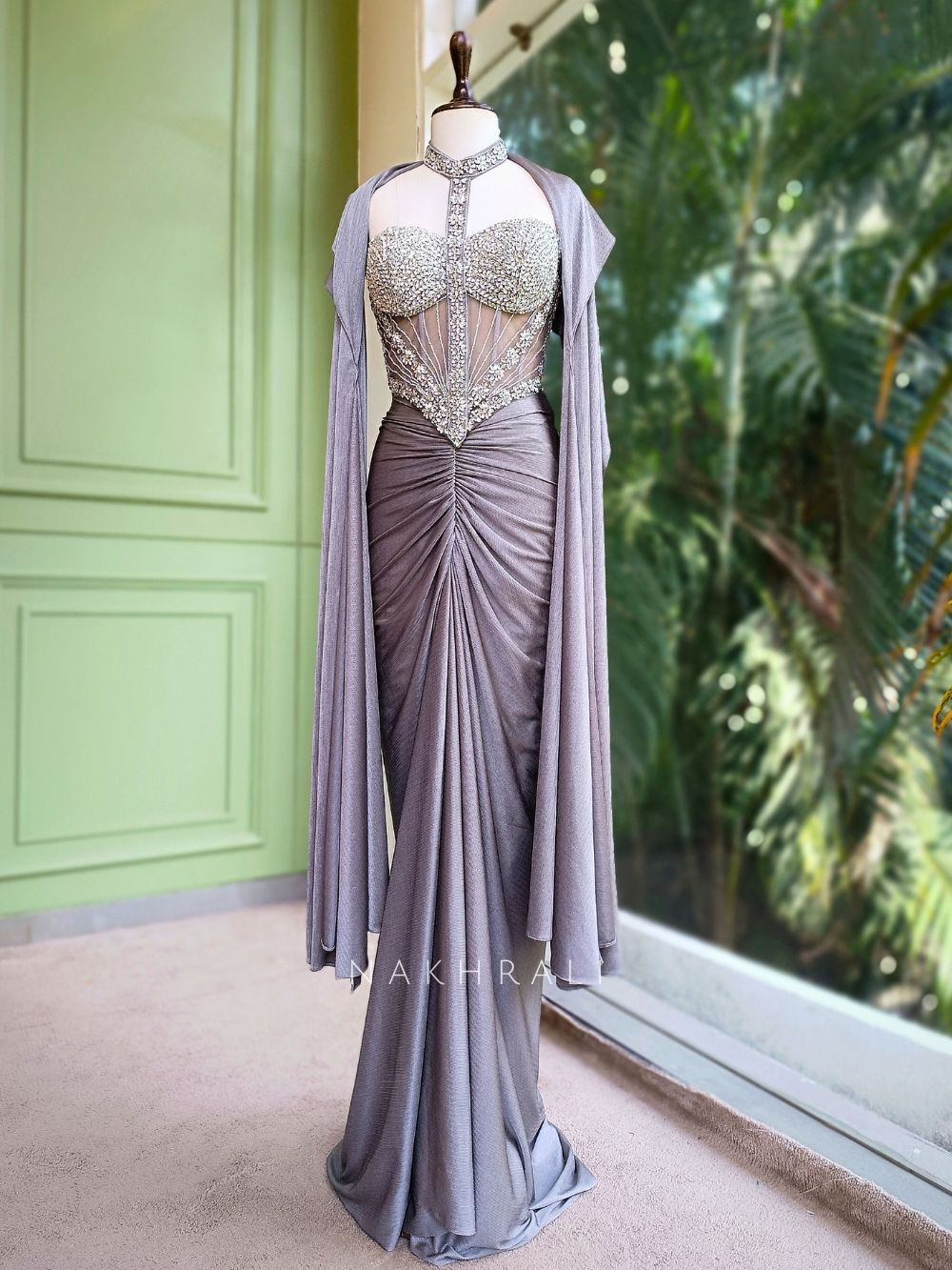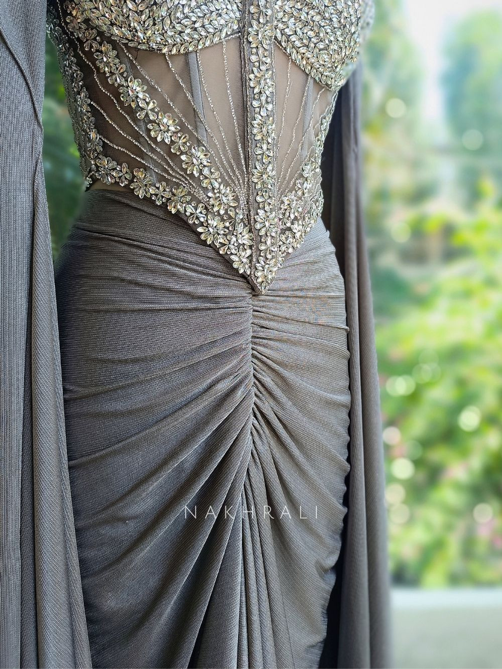 Serene Silver Corset Skirt Set with Stone Embellished Work