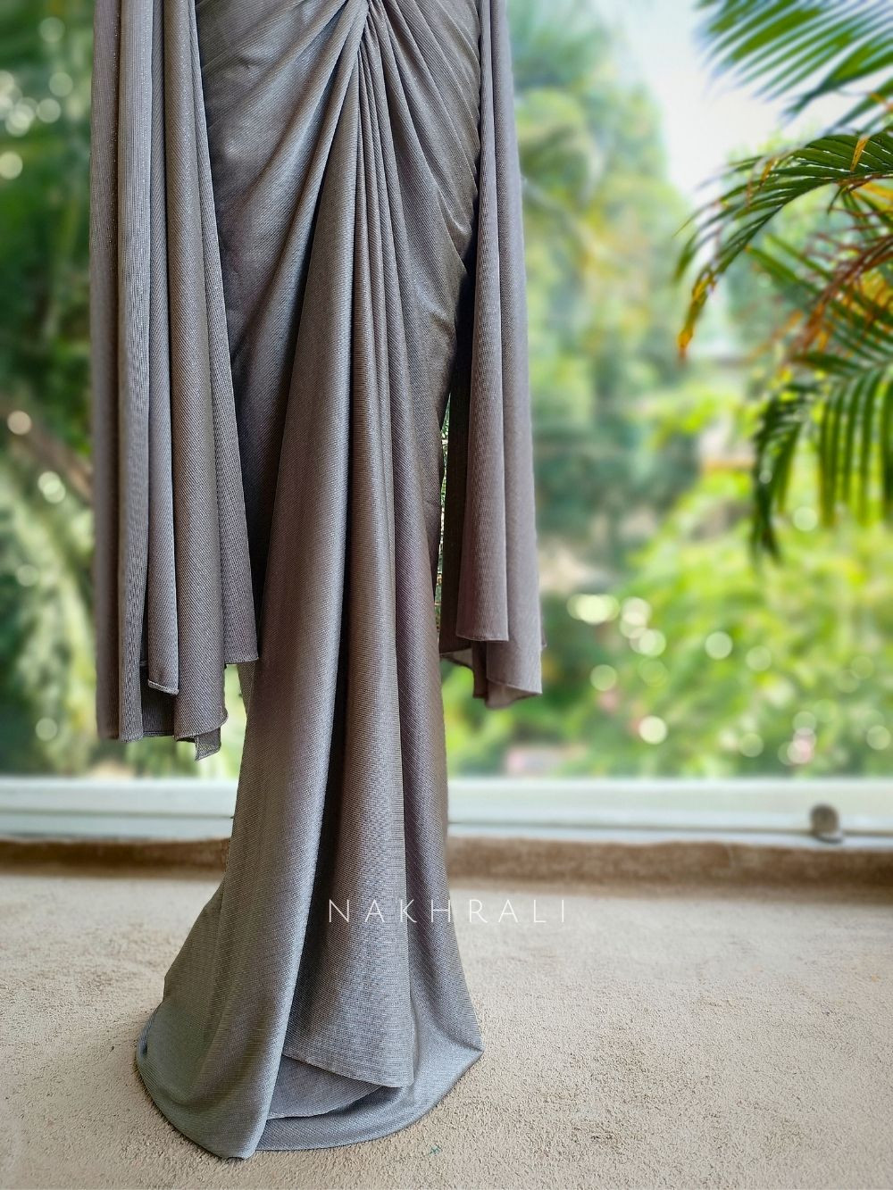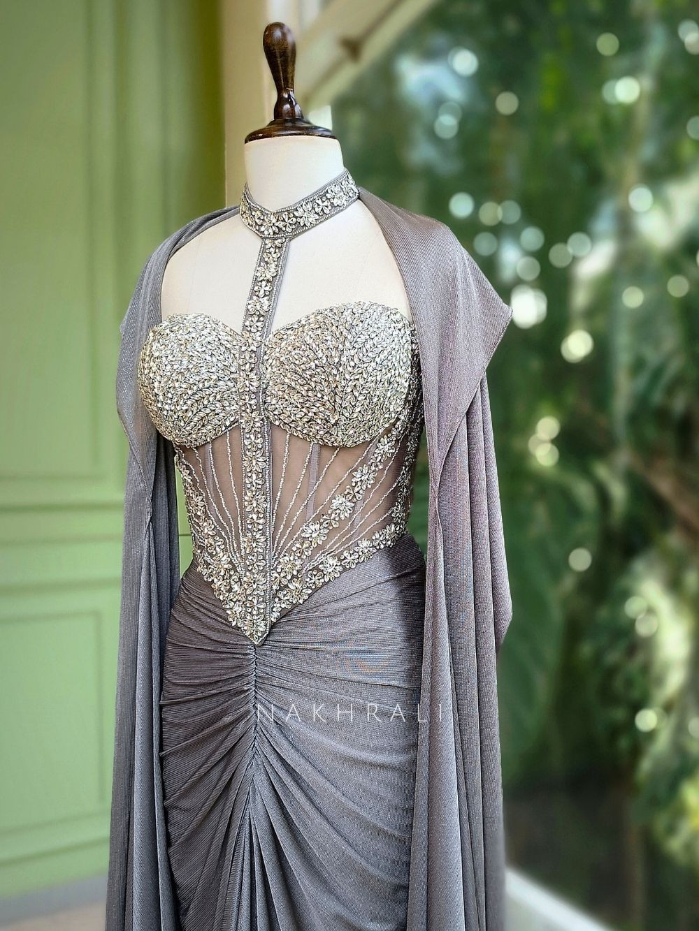The Serene Silver Corset Skirt Set exudes modern sophistication with its stunning stone-embellished corset top and ruched draped skirt. The figure-enhancing silhouette highlights intricate detailing with crystal stones and sequin work that sparkle under the lights. A matching sheer dupatta gracefully completes the ensemble, making it perfect for cocktail nights, receptions, and glamorous soirées. The back lace-up design adds a touch of allure and perfect fit, making it as comfortable as it is elegant.