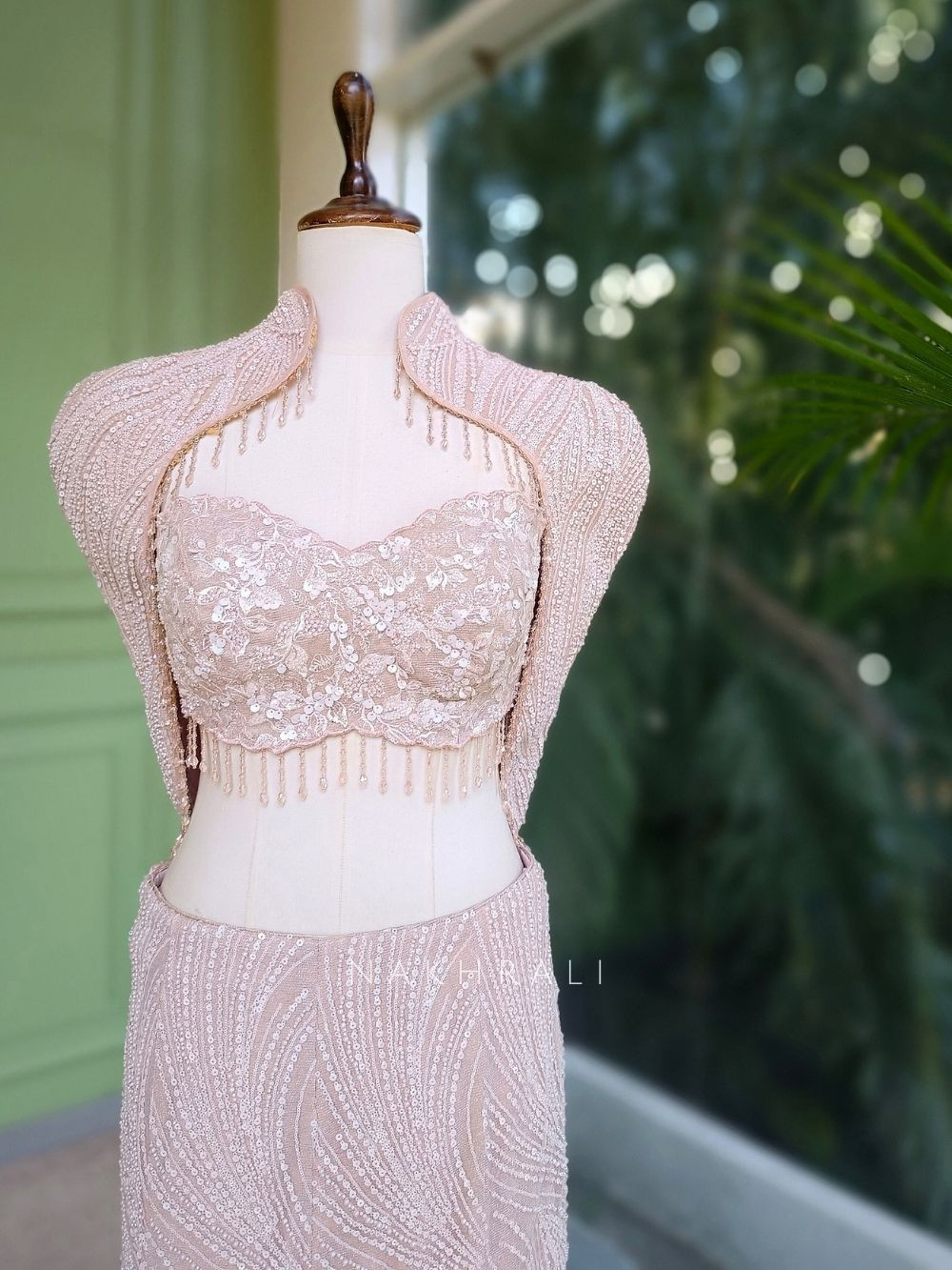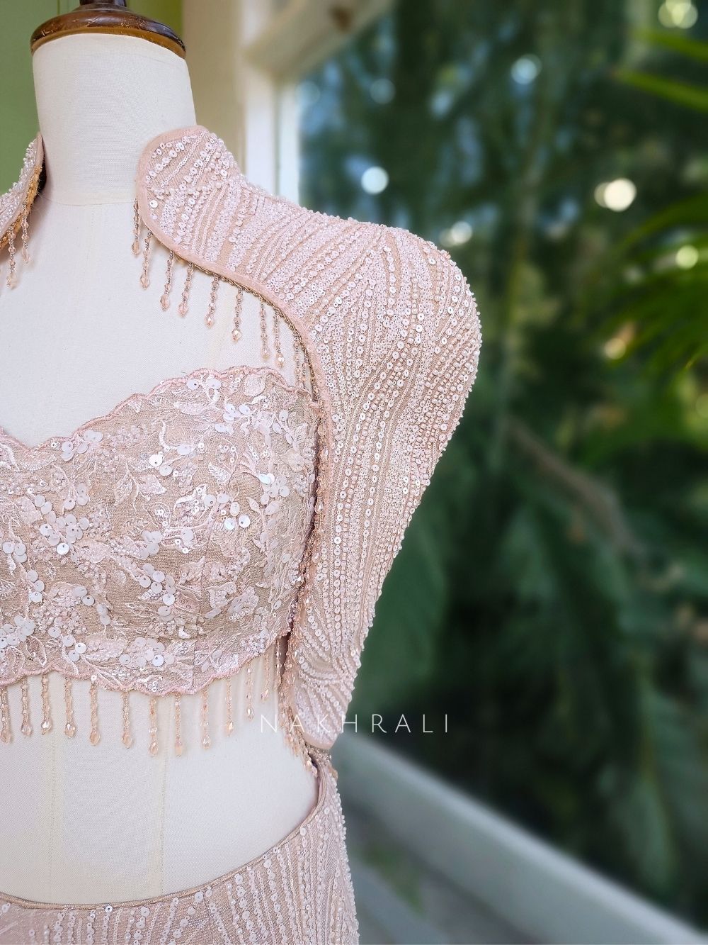 This blush-pink crop top and skirt set blends modern glamour with delicate craftsmanship. The net crop top is adorned with fine sequins and cut-dana embroidery, adding soft shimmer without overpowering the design. The fitted skirt features flowing handwork patterns that enhance movement and shape. A structured cape draped over the shoulders elevates the outfit, creating a polished, fashion-forward silhouette ideal for receptions, cocktail nights, and high-glam events.
