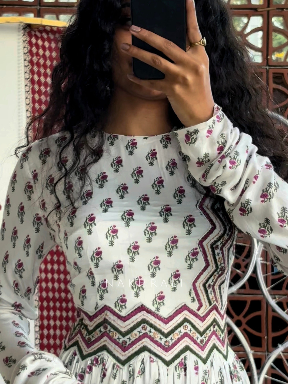 The Autumn White Crop Top & Skirt Set is a timeless piece that redefines minimal grace. Crafted in soft cotton, it features delicate maroon floral prints all over with chevron embroidery at the waist for a flattering silhouette. The full-sleeve crop top adds sophistication, while the flared skirt moves gracefully with every step. Ideal for brunches, cultural gatherings, and casual festive wear — it’s where comfort meets classic charm in every detail.
