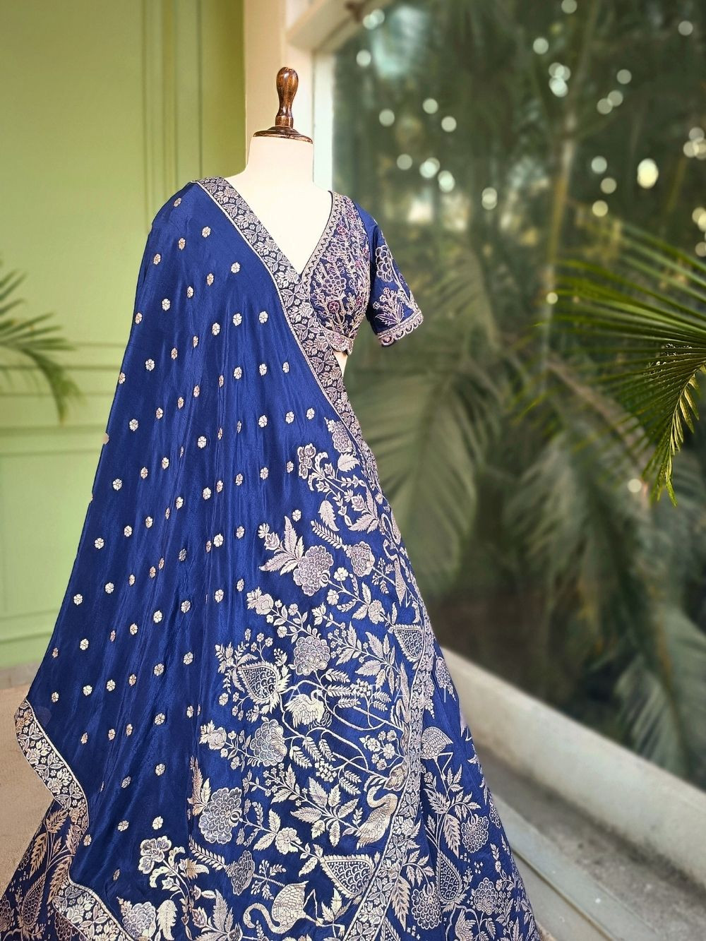 This blue lehenga set is defined by its detailed silver brocade-style motifs spread evenly across the skirt, creating a graceful and structured look. The blouse features dense silver embroidery with a flattering V neckline and short sleeves, finished with fine edging. The lehenga’s broad woven border enhances its richness, while the matching dupatta is adorned with delicate motifs and a detailed border that complements the overall design. Balanced, timeless, and elegant, this set is designed for celebrations that call for understated luxury.