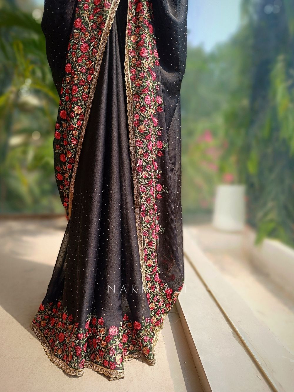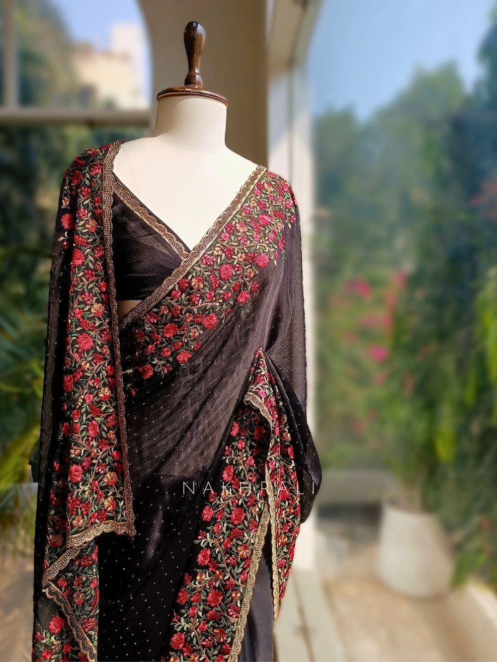 This georgette saree brings back vintage elegance with its beautifully embroidered floral border, crafted in rich tones that stand out against the soft drape. The body features subtle dotted detailing, giving the saree a graceful fall and refined texture. The retro-inspired border adds depth and luxury, making it perfect for cocktail nights, receptions, festive family gatherings and elegant evening celebrations. It comes with a matching running blouse piece attached to the saree for custom stitching.