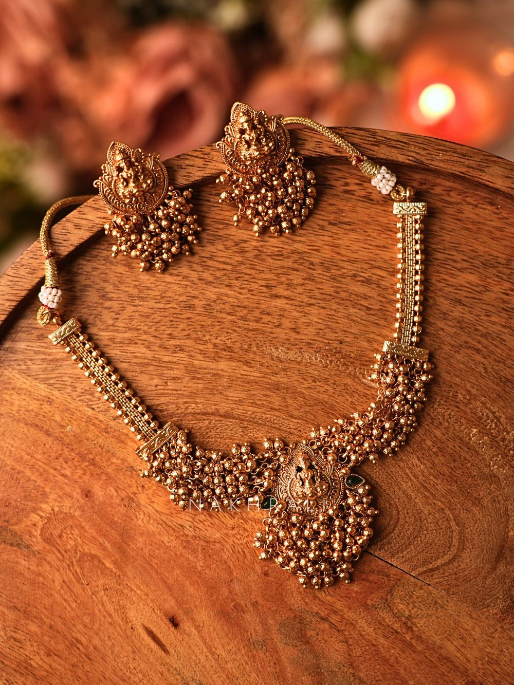 This temple jewellery set is crafted in an antique gold tone and features a richly detailed central motif inspired by traditional temple artistry. The necklace is adorned with clustered gold beads that add volume and movement, while subtle green stone highlights bring balance and contrast to the design. The matching earrings mirror the same motif and bead detailing, completing the set with a bold yet graceful presence. Designed to feel regal and rooted, this piece makes a strong statement for festive and traditional occasions.