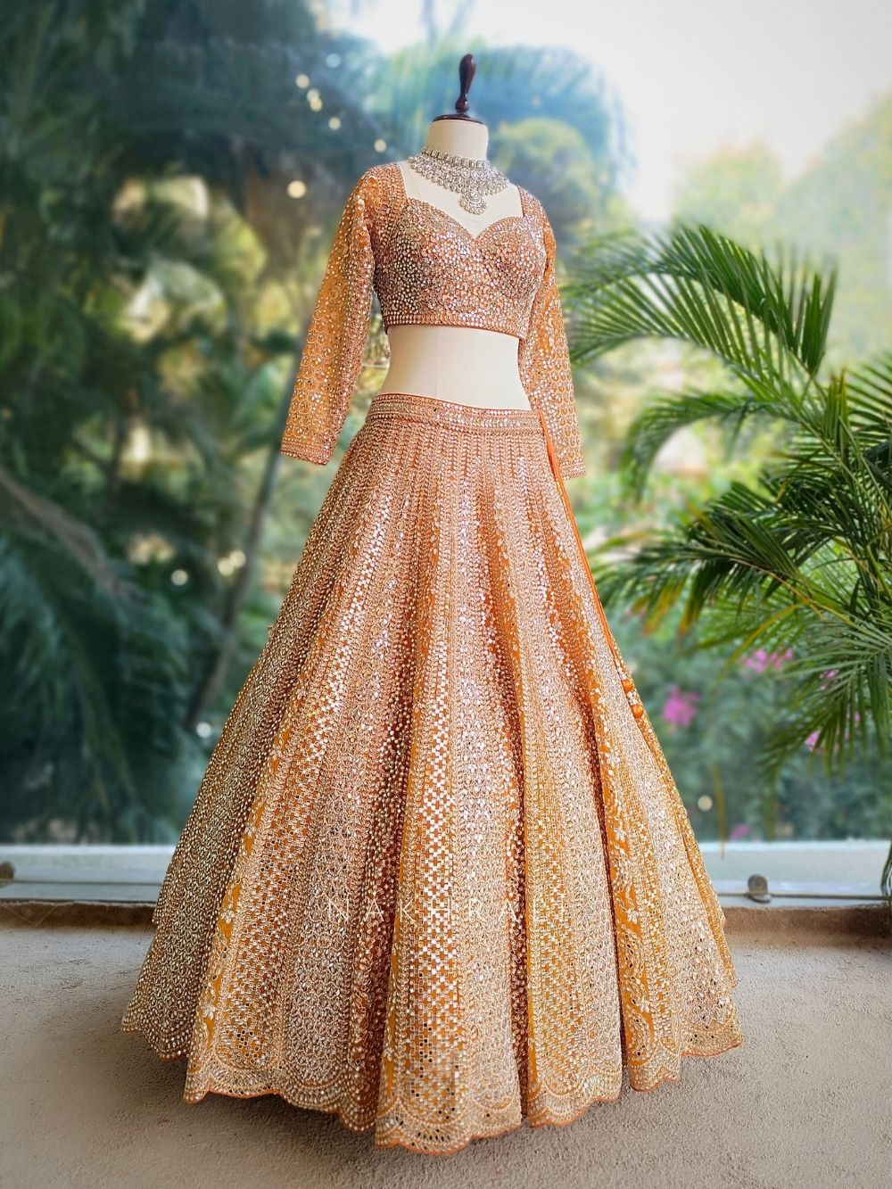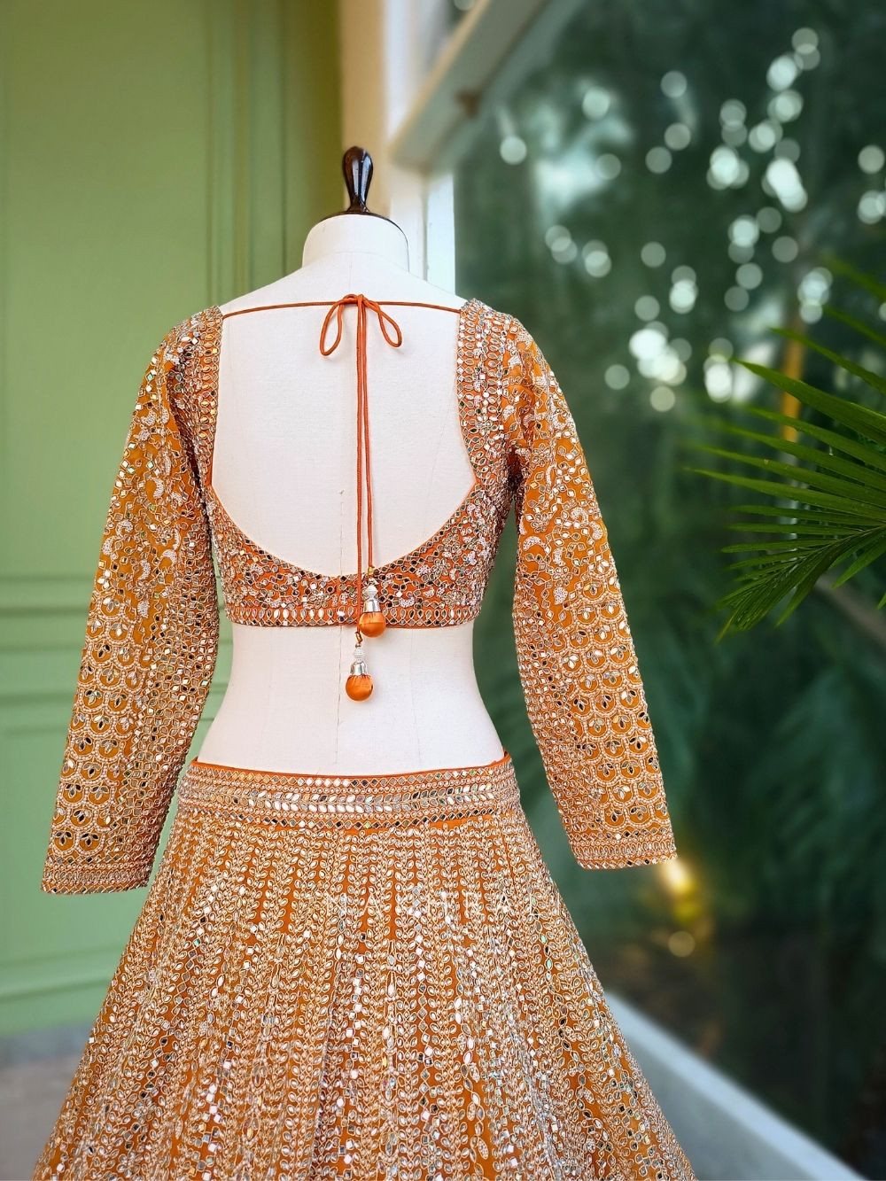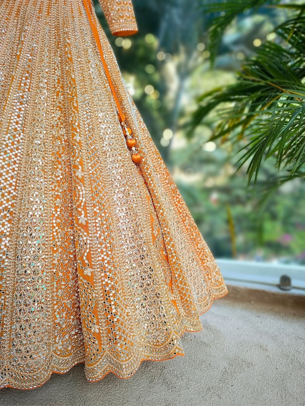Sitara Orange Net Lehenga with Mirror, Zari and Bead Embellishments