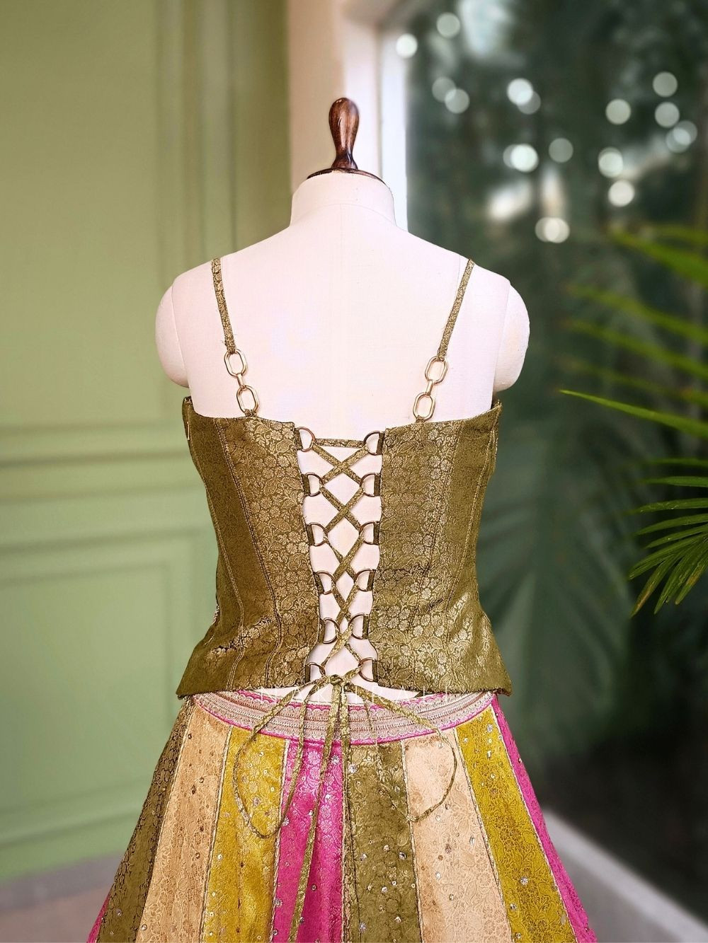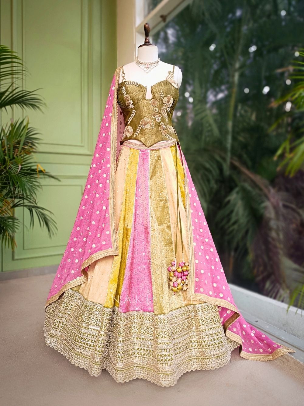 This green multicolor lehenga blends traditional richness with a modern silhouette. The sculpted corset blouse showcases detailed zari threads, stones, and floral motifs, adding depth and structure. The skirt is crafted in alternating green, pink, and beige brocade-style panels with subtle shimmering accents. Finished with a soft pink dupatta adorned with gold butis and a matched border, this ensemble is perfect for Mehendi, festive celebrations, or daytime functions with a bold twist.