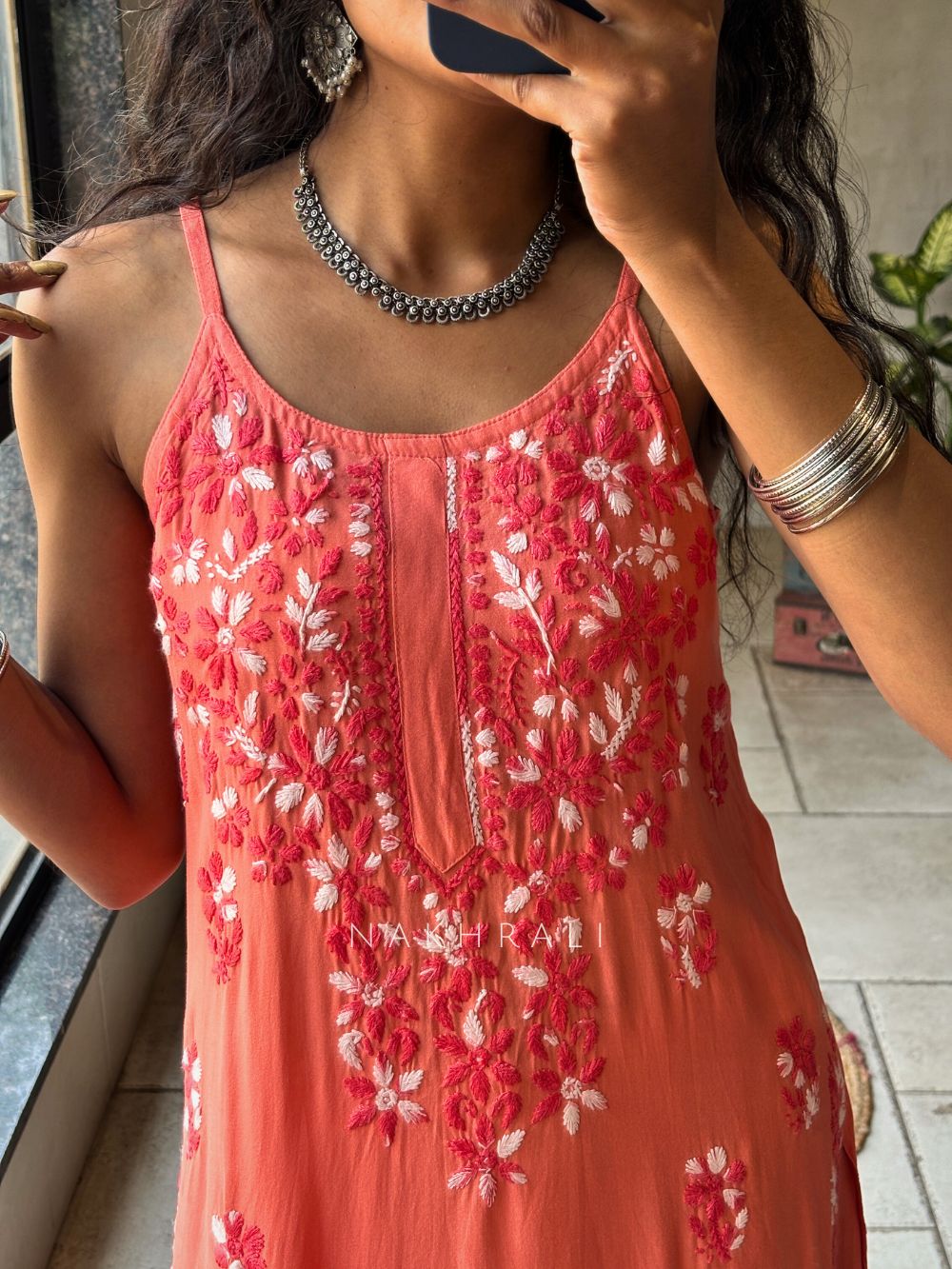 Designed for effortless summer dressing, this kurta pant set features a spaghetti strap kurta adorned with intricate chikankari embroidery spread beautifully across the outfit. The airy rayon fabric ensures comfort in warm weather, while the detailed work on the kurta and pant hems adds a refined traditional touch. Its relaxed silhouette makes it ideal for everyday wear, casual outings, and daytime gatherings without compromising on elegance.