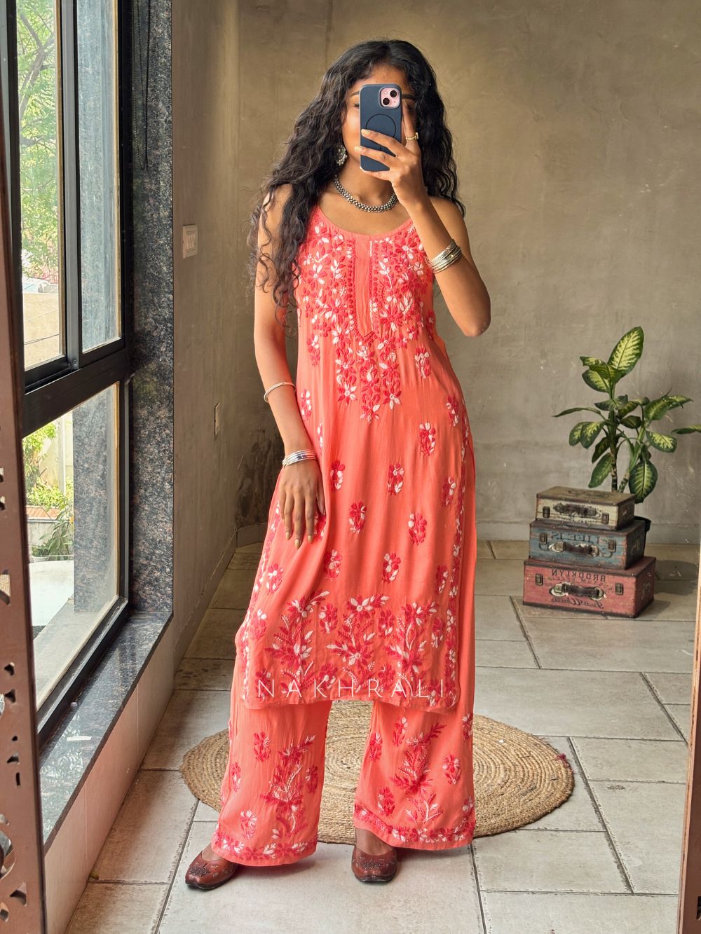 Solira Coral Peach Rayon Kurta Pant Set with Chikankari Work