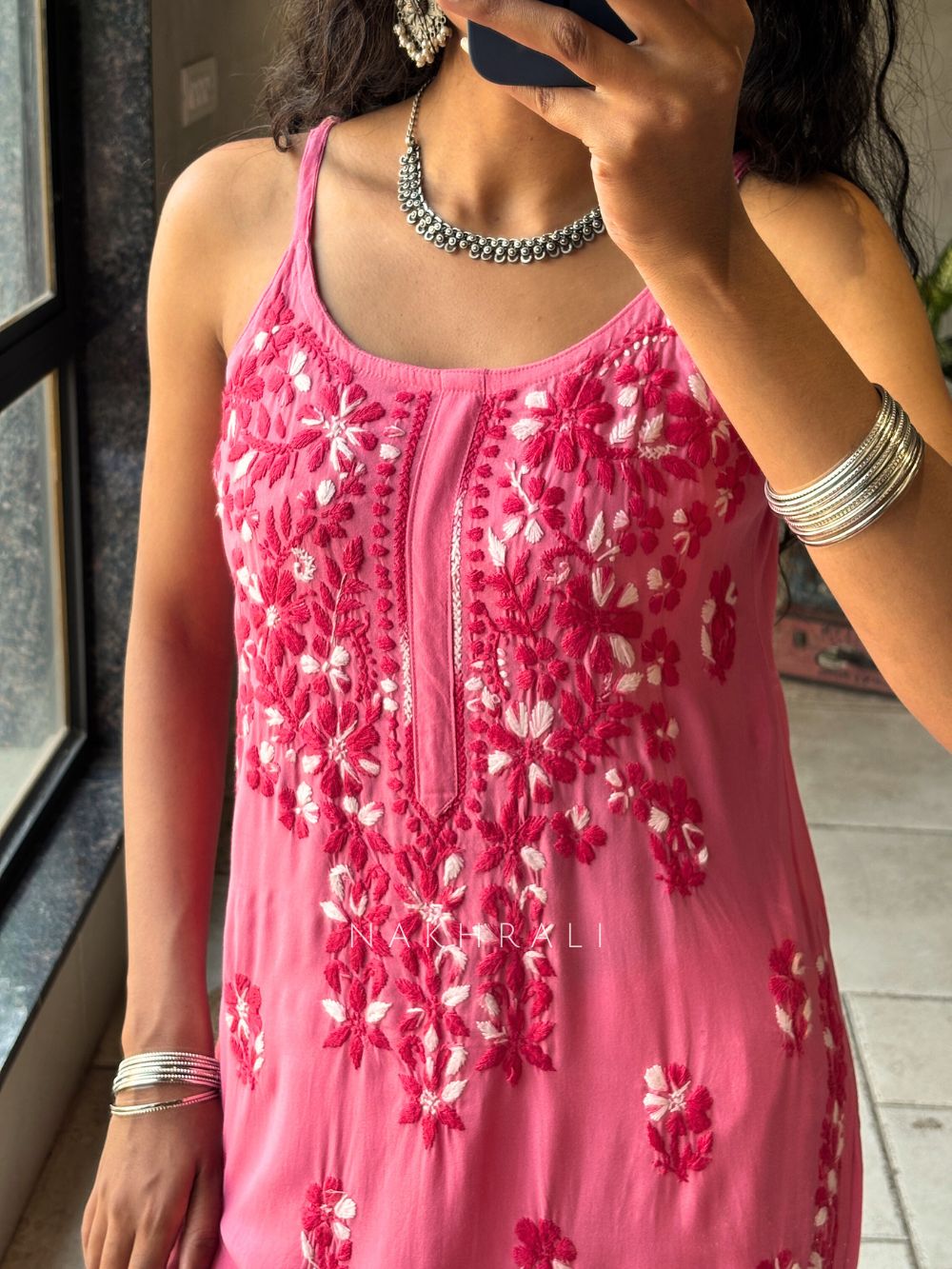 Designed for effortless summer dressing, this kurta pant set features a spaghetti strap kurta adorned with intricate chikankari embroidery spread beautifully across the outfit. The airy rayon fabric ensures comfort in warm weather, while the detailed work on the kurta and pant hems adds a refined traditional touch. Its relaxed silhouette makes it ideal for everyday wear, casual outings, and daytime gatherings without compromising on elegance.
