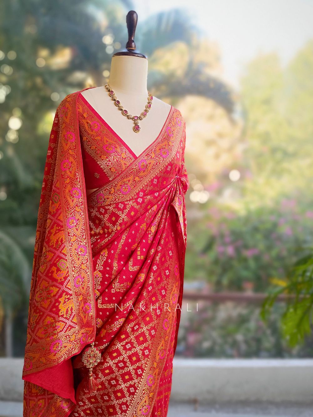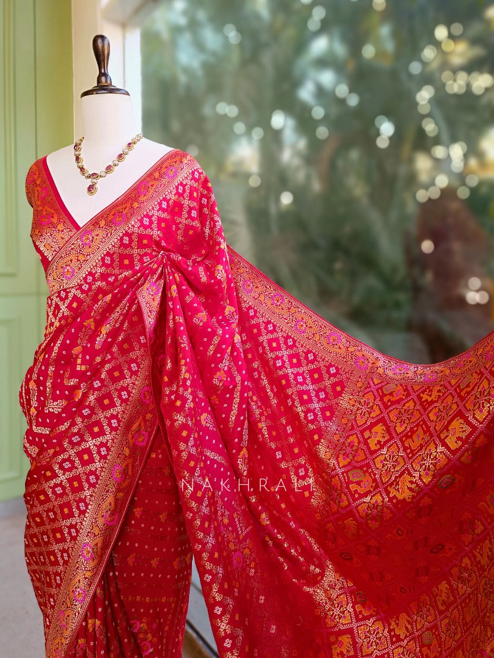 This saree showcases the beauty of classic bandhani artistry with finely arranged motifs spread across the drape. The design is enhanced with an intricately detailed border that adds depth and richness to the overall look. The pattern blends traditional craftsmanship with a refined visual appeal, making the saree suitable for festive gatherings, cultural celebrations, and elegant daytime occasions. The graceful drape highlights the intricate prints beautifully. It comes with a matching running blouse piece attached to the saree, allowing it to be stitched in the preferred style.