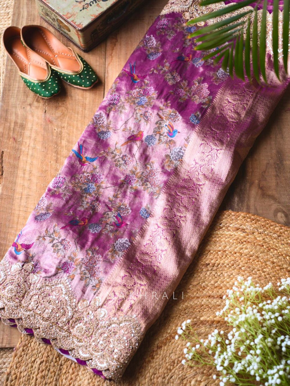 The Song of Meadows Saree is a lyrical blend of nature and artistry. Crafted in rich fabric and available in serene shades of pink, purple, and green, it features exquisite floral and bird prints that echo the beauty of blooming meadows. Intricate zari and stone embroidery add a luminous charm, while the scalloped border enhances its regal grace. Ideal for weddings, festivities, and elegant gatherings, this saree is a celebration of timeless femininity and refined craftsmanship.