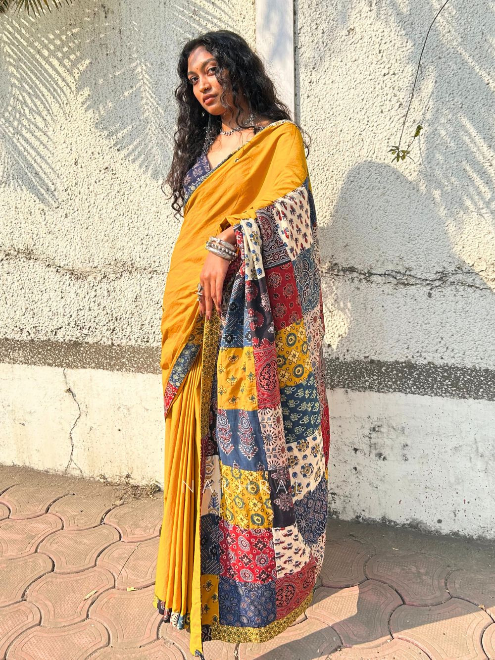 This cotton saree brings together everyday comfort and artisanal detailing in a beautifully balanced silhouette. The soft cotton body falls effortlessly, making it ideal for long hours of wear, while the statement border is enhanced with patchwork panels created using assorted block-printed fabrics. Each border tells a unique story through its mix of traditional motifs and colours, adding depth and character to the saree. Finished with a coordinated edge and paired with an unstitched blouse piece, this saree is perfect for those who appreciate craft-led design with a contemporary sensibility.