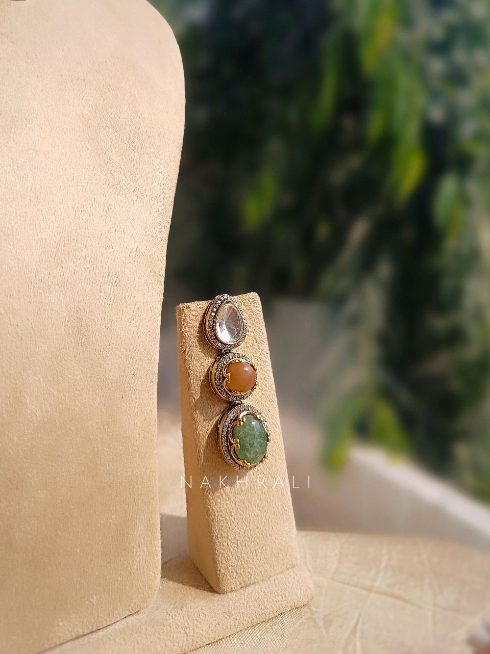 This multicolor stone necklace set brings a striking blend of elegance and artistry. Designed with statement oval and teardrop stones in varied hues, it sits beautifully on the neckline and instantly enhances any festive or wedding outfit. The handcrafted detailing and glossy finish give it a premium, polished appeal. Paired with matching tri-stone earrings, this set elevates both ethnic and Indo-western looks with effortless charm and color pop.