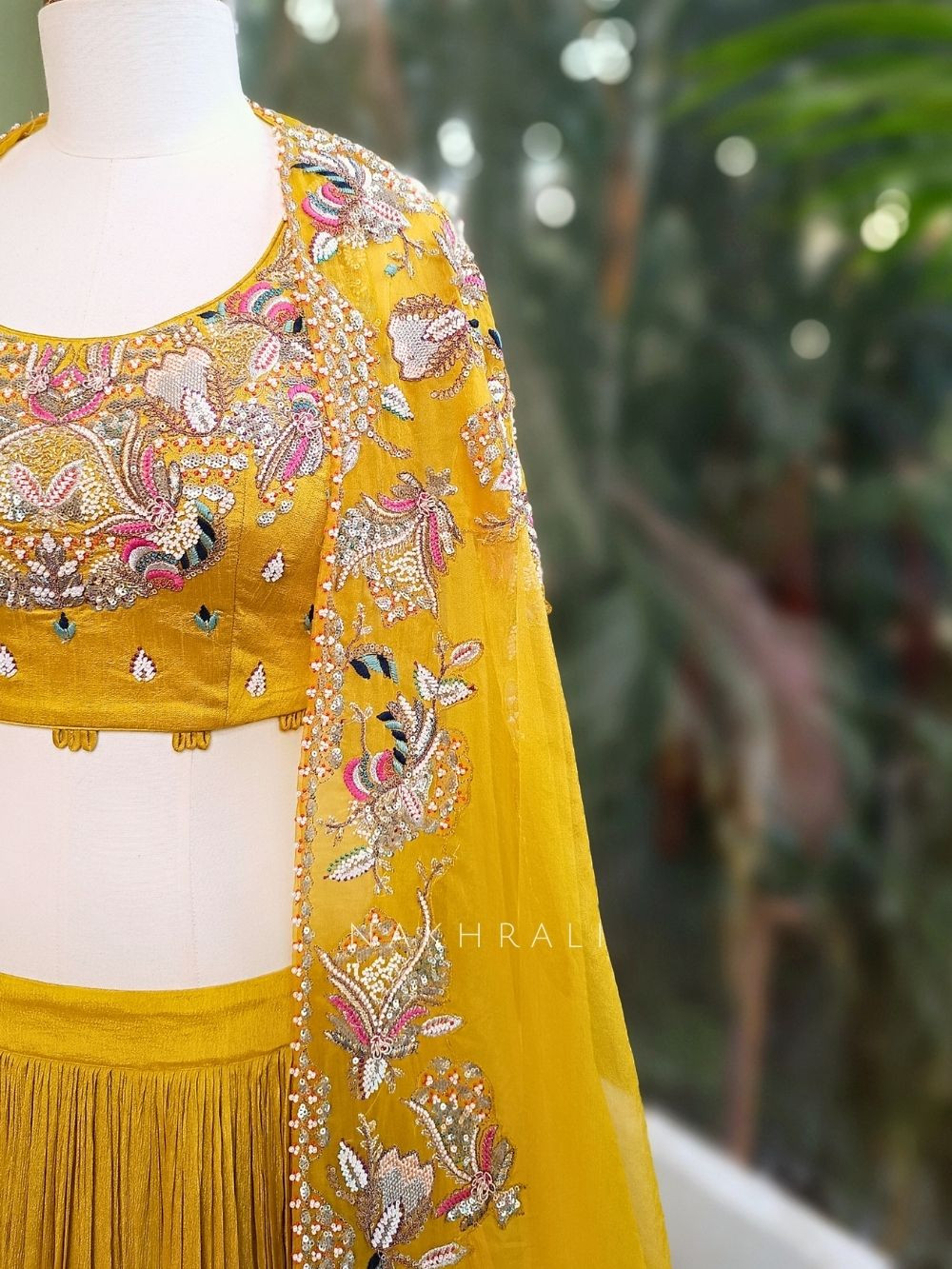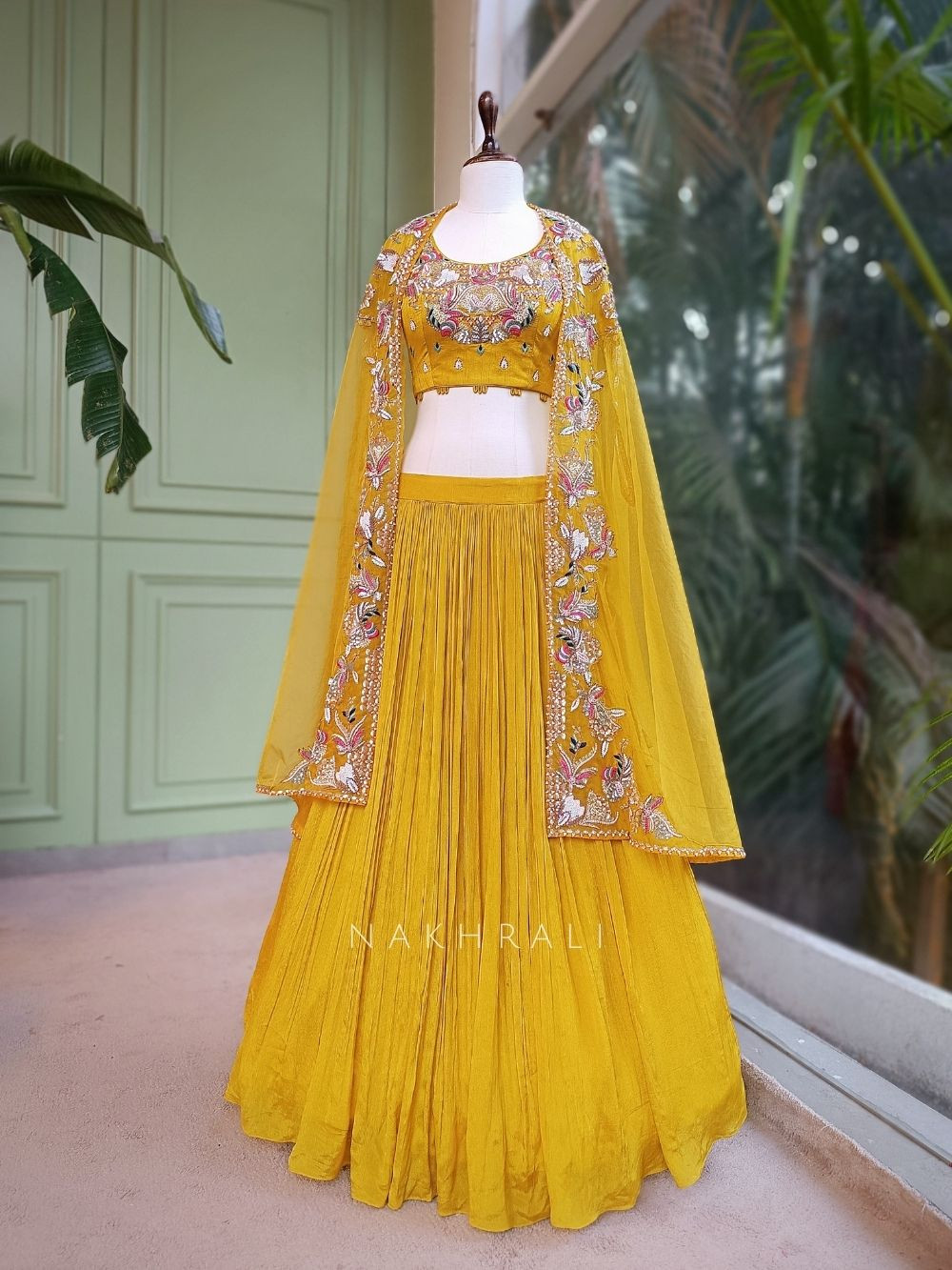 This yellow lehenga set showcases detailed thread embroidery highlighted with cut dana and sequin work across the sleeveless blouse and the embellished cape . The blouse features a rounded neckline and a fitted silhouette, while the cape adds depth and festive elegance with its embroidered borders. The pleated lehenga skirt offers graceful movement and balance, making the set ideal for daytime weddings, haldi functions, and festive celebrations.