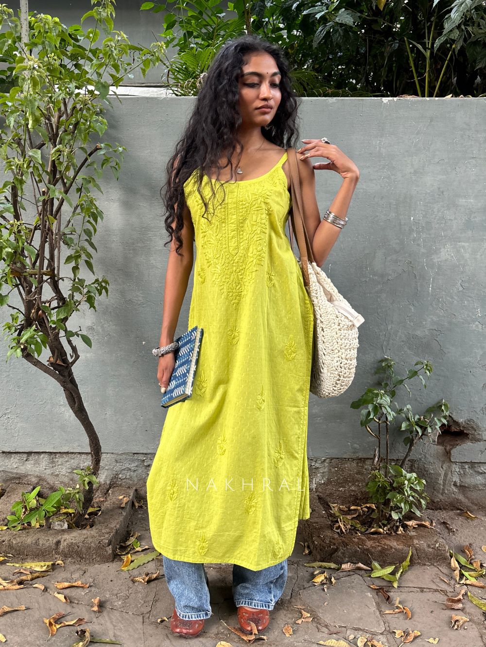 This elegant sleeveless kurti is designed to keep summer dressing simple, breathable and stylish. Featuring intricate chikankari embroidery on the front panel along with scattered embroidered motifs, the design adds subtle handcrafted detail while maintaining a minimal aesthetic. The sleeveless cut and relaxed straight silhouette make it extremely comfortable for warm weather. Side slits allow easy movement and effortless styling with denims, trousers or ethnic bottoms. Perfect for casual outings, everyday wear and relaxed daytime plans, this kurti offers a beautiful balance of traditional embroidery and modern summer ease.