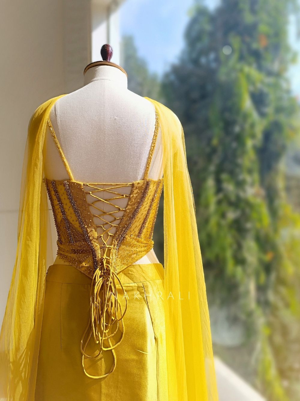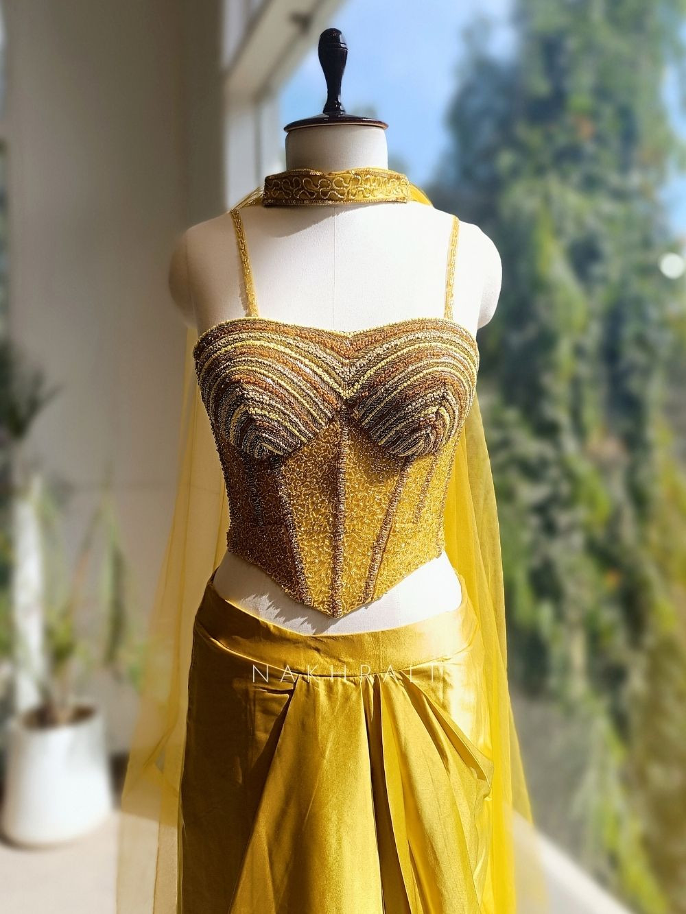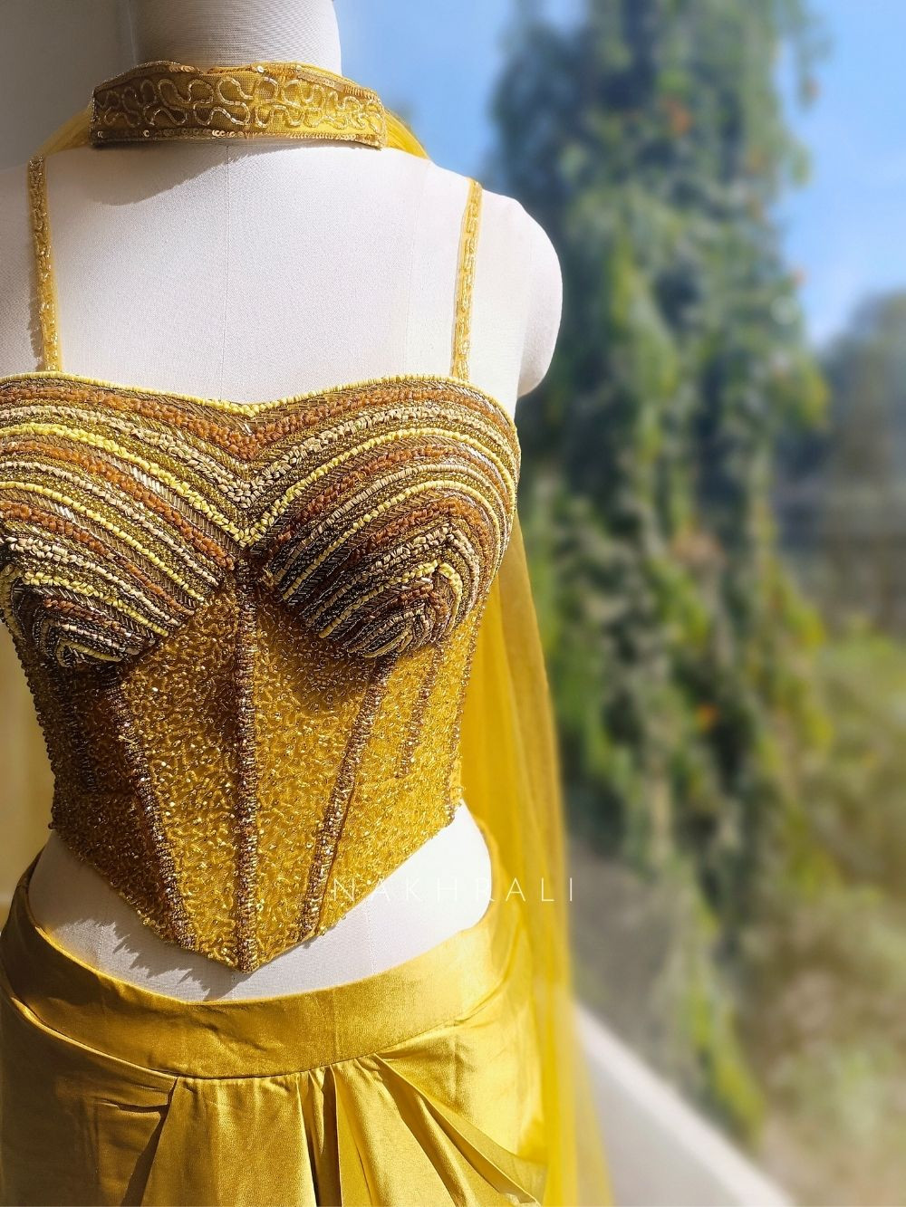 The Sunehri Corset Drape Skirt Set is a statement ensemble crafted for contemporary celebrations. The structured corset-style crop top features intricate hand embroidery that enhances the sculpted silhouette, finished with delicate straps and a lace-up back for an adjustable fit. The skirt is beautifully draped, offering fluid movement and a refined fall that balances structure with softness. Completing the set is a matching sheer dupatta styled as a choker, adding a bold yet elegant layer to the look. Designed for those who prefer standout styling without heaviness, this set is ideal for festive evenings, cocktail functions, haldi events, and modern wedding gatherings.