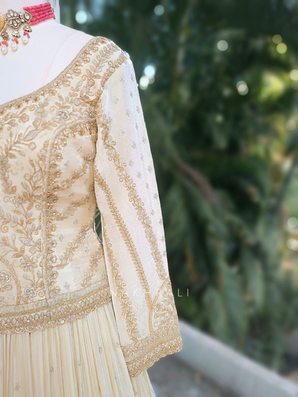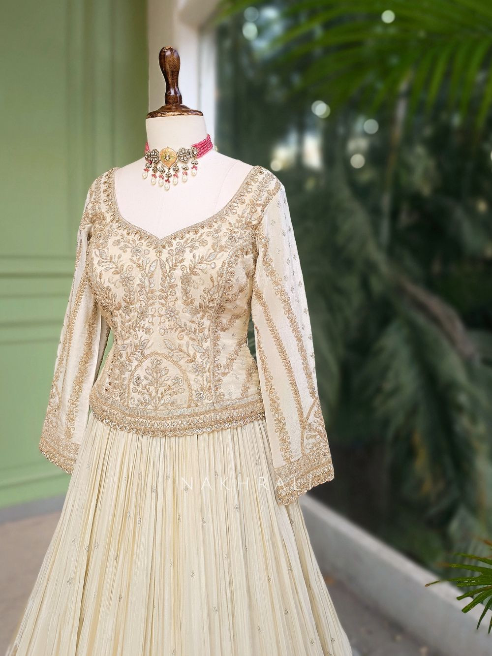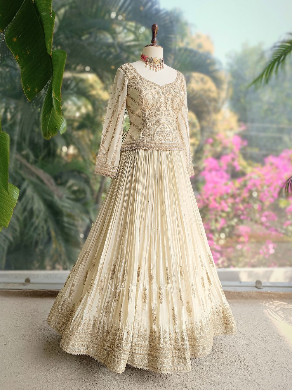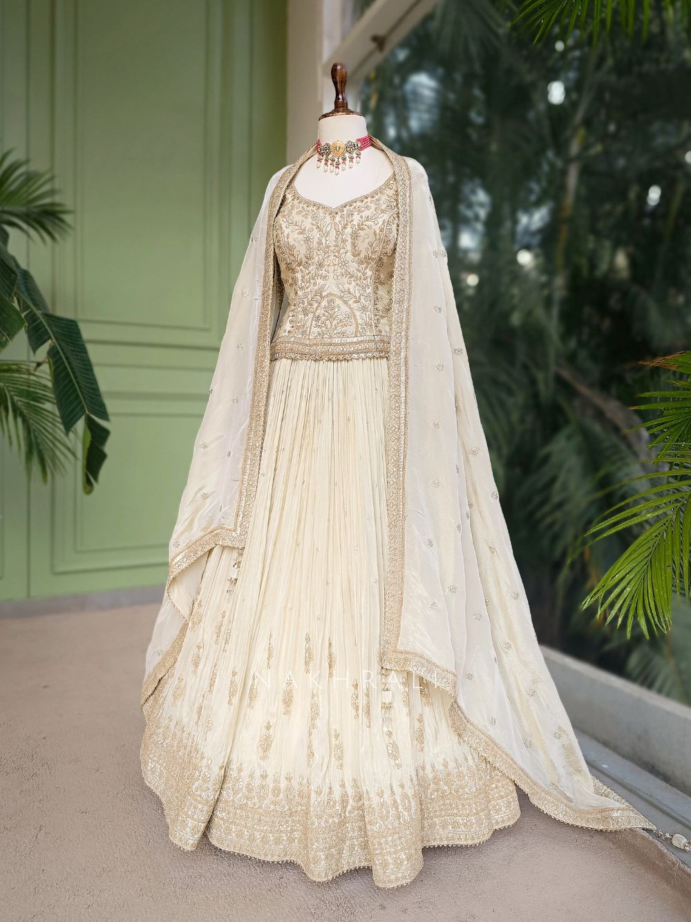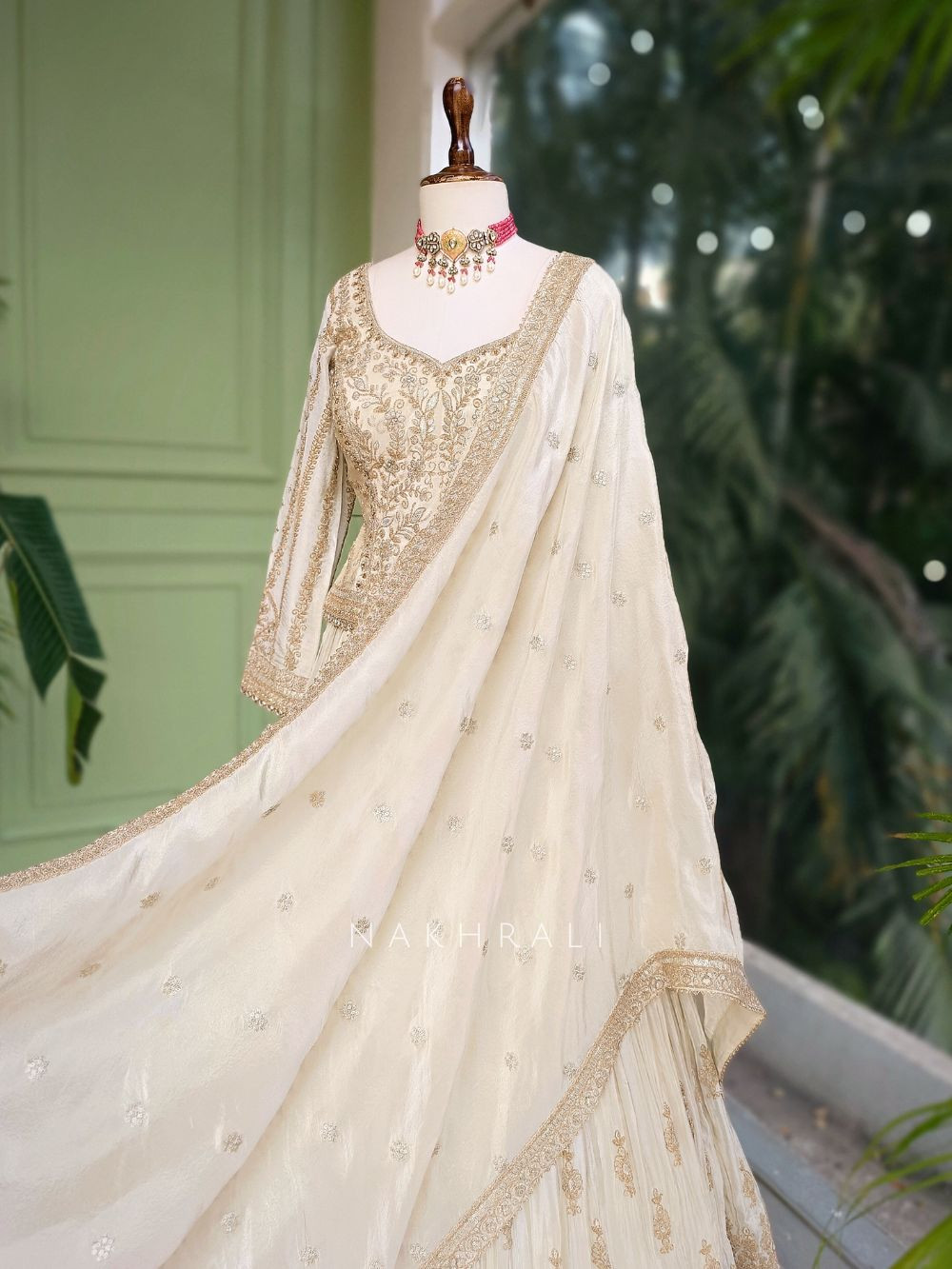 This cream lehenga set is designed with a beautifully tailored short kurta highlighted by intricate embroidery across the neckline, sleeves, and hem. The kurta pairs seamlessly with a voluminous flared lehenga detailed with delicate motifs and an ornate embroidered border that adds richness without heaviness. Completing the set is a soft dupatta finished with fine detailing, making the overall silhouette elegant, balanced, and perfect for refined celebrations.