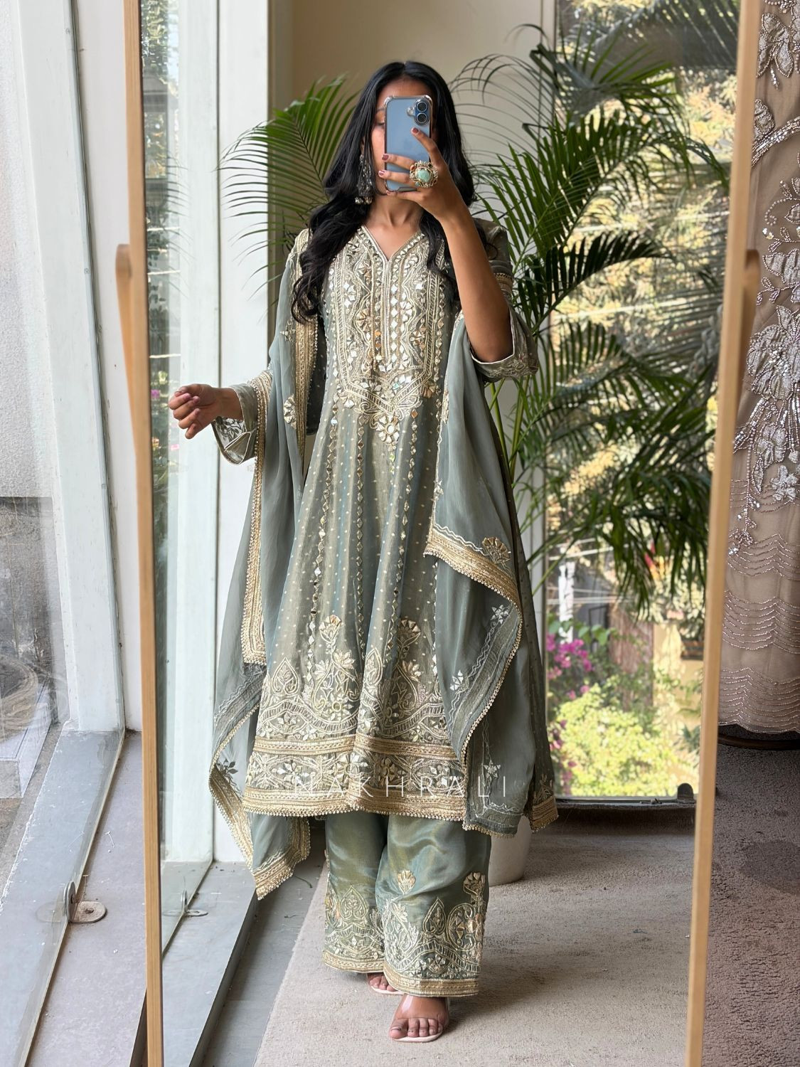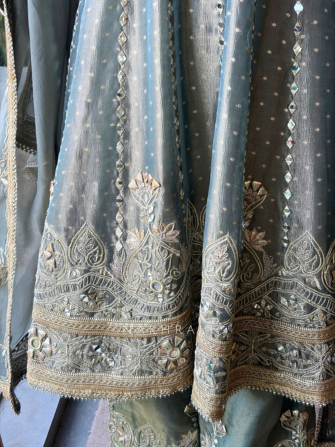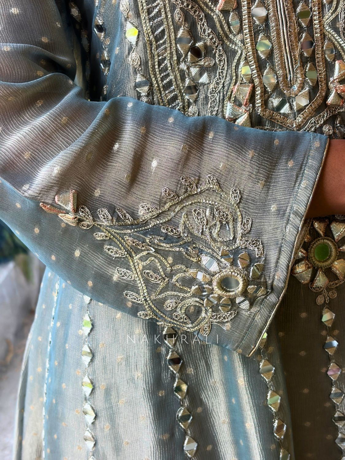 Sylvara Grey Tissue Suit Set with Mirror and Gota Patti Work