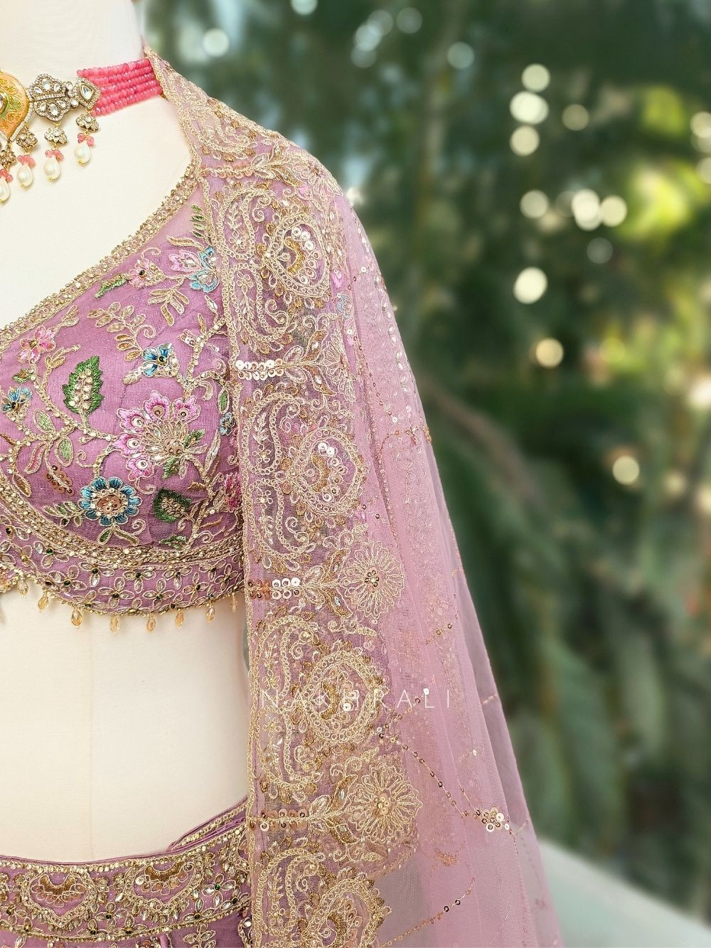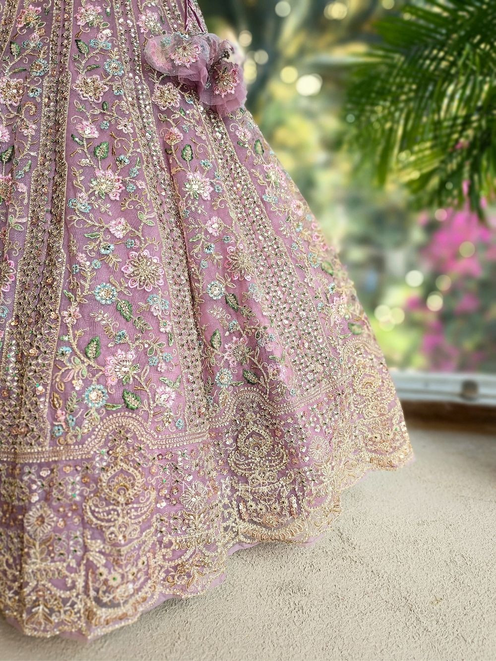 This lehenga set showcases delicate all-over floral embroidery crafted with fine threadwork, sequins, and subtle bead detailing that adds depth without overpowering the design. The lehenga flows gracefully with a richly embroidered hem, while the matching blouse features a structured neckline, fitted silhouette, and embroidered sleeves that elevate the overall look. Completing the set is a sheer embroidered dupatta that adds softness and balance, making it an ideal choice for weddings, festive occasions, and intimate celebrations where elegance takes center stage.