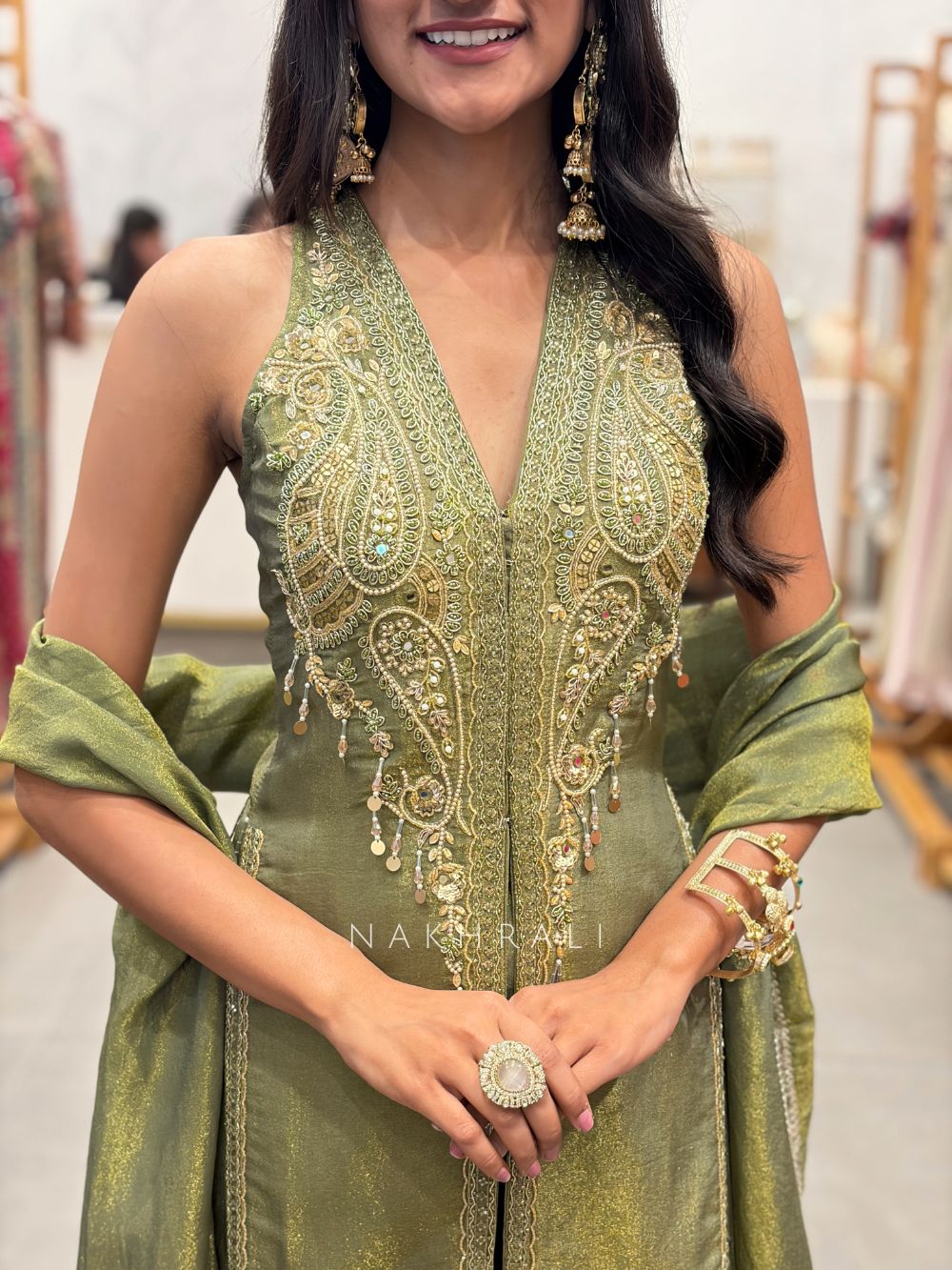 • Sangeet Night: Pair with bold chandbali earrings and metallic heels for a vibrant festive look.