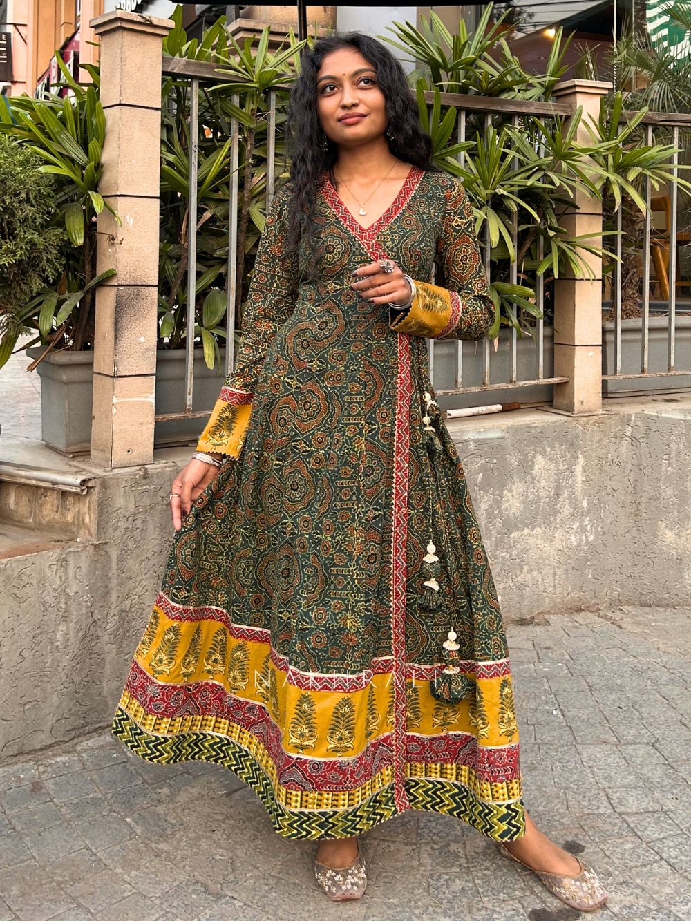 This angrakha kurta is designed with a classic wrap-style silhouette that enhances the fit while offering ease of movement. It features detailed all-over ethnic prints complemented by contrast borders and tassel tie-up detailing on the side. The flowy structure and comfortable feel make it ideal for daily wear, casual outings, and relaxed festive moments. A perfect blend of traditional design with effortless styling.