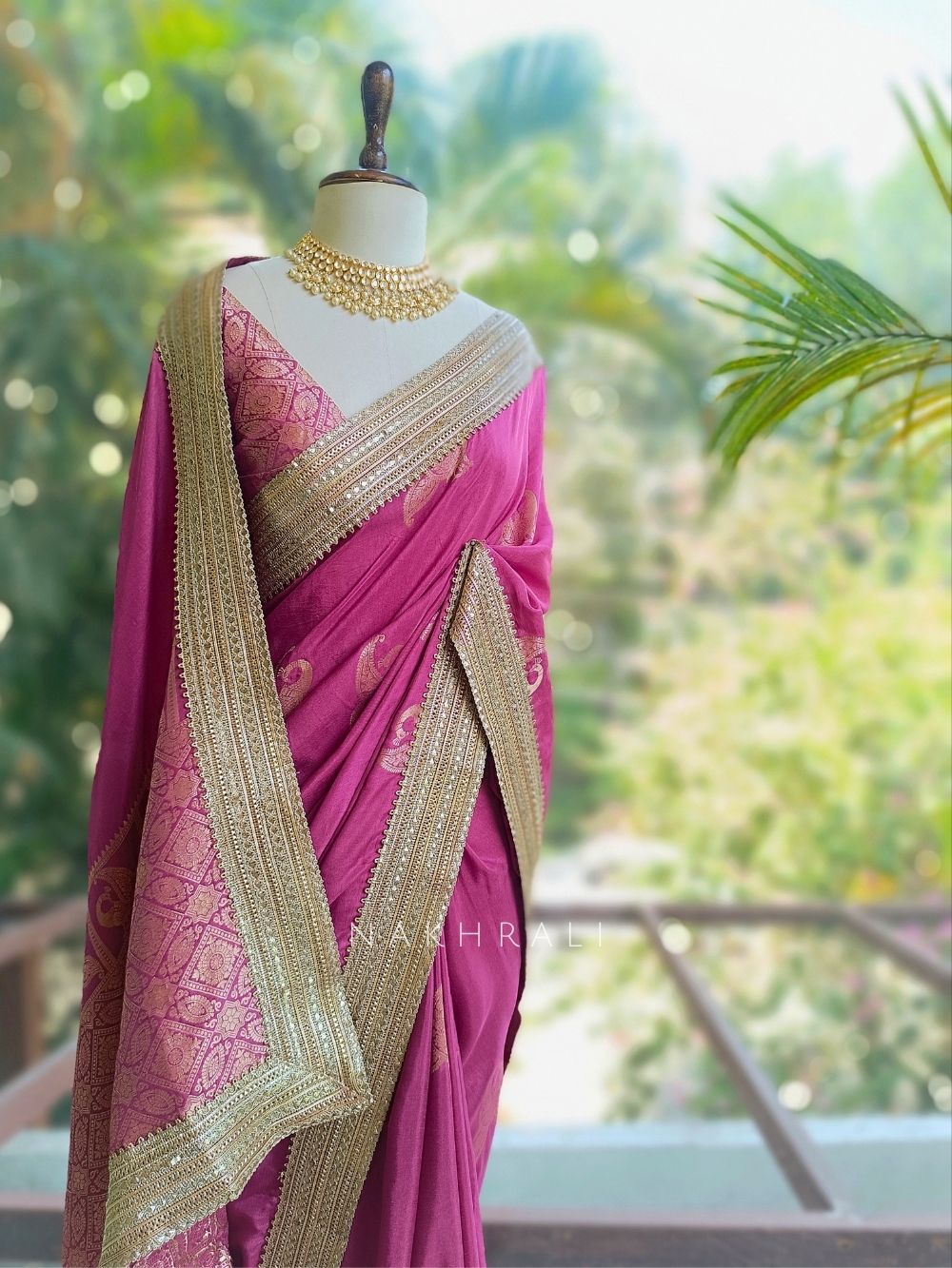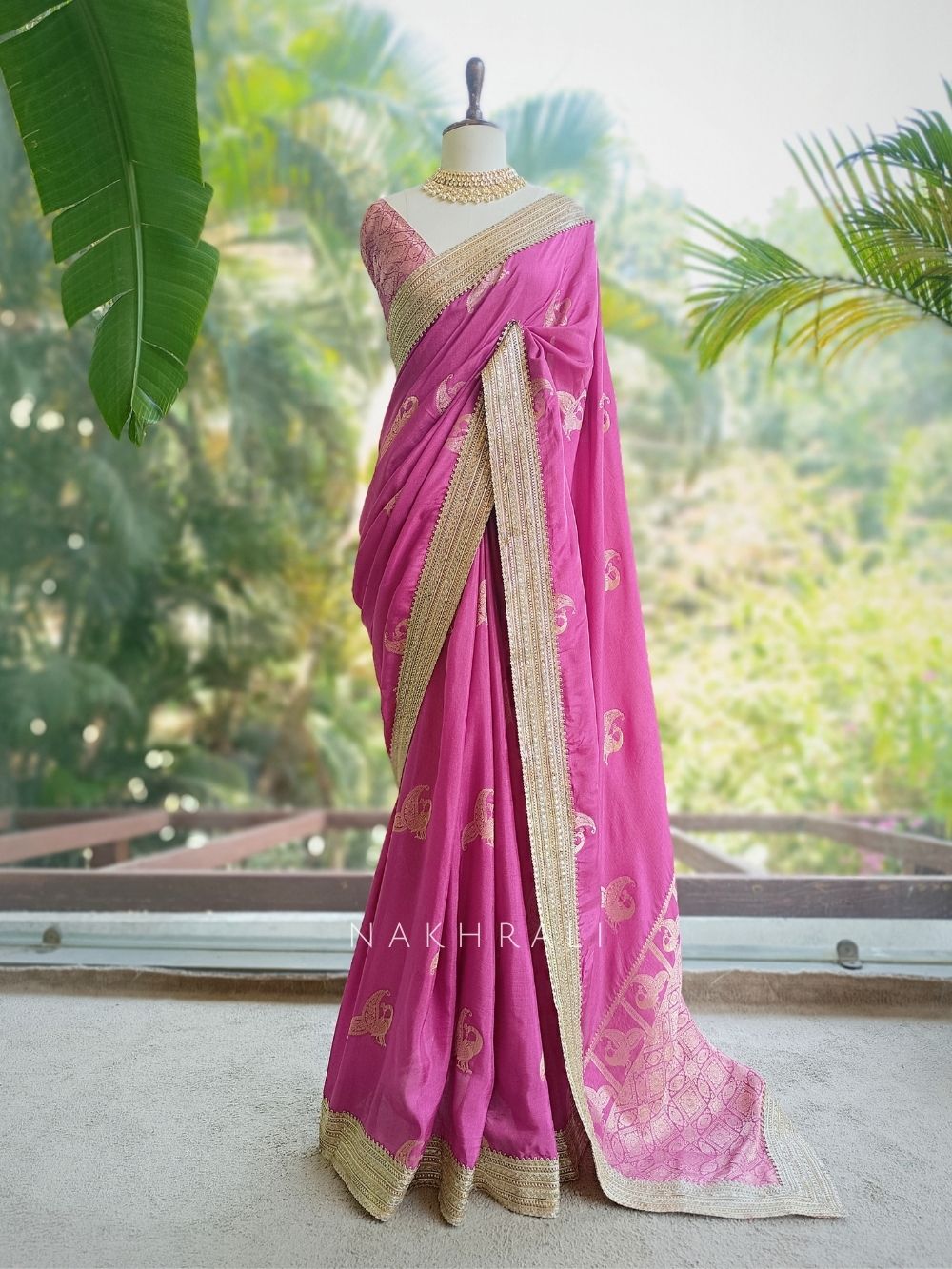 Tavira Raspberry Saree with Broad Border and Unstitched Blouse Piece