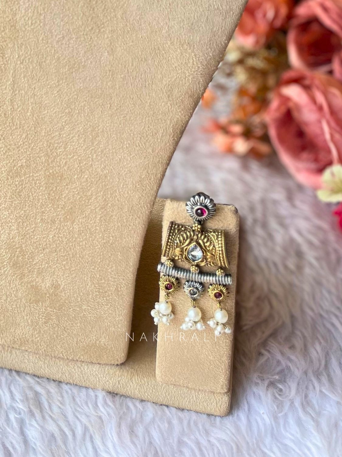 This striking necklace set features layered oxidised elements paired with antique gold highlights and soft pearl drops that create a rich, traditional presence. The structured collar-style design sits beautifully on the neckline, while intricate motifs and subtle stone detailing add depth and character. Finished with coordinated earrings, this set is ideal for festive occasions, wedding functions, and traditional celebrations where bold yet refined jewellery completes the look.