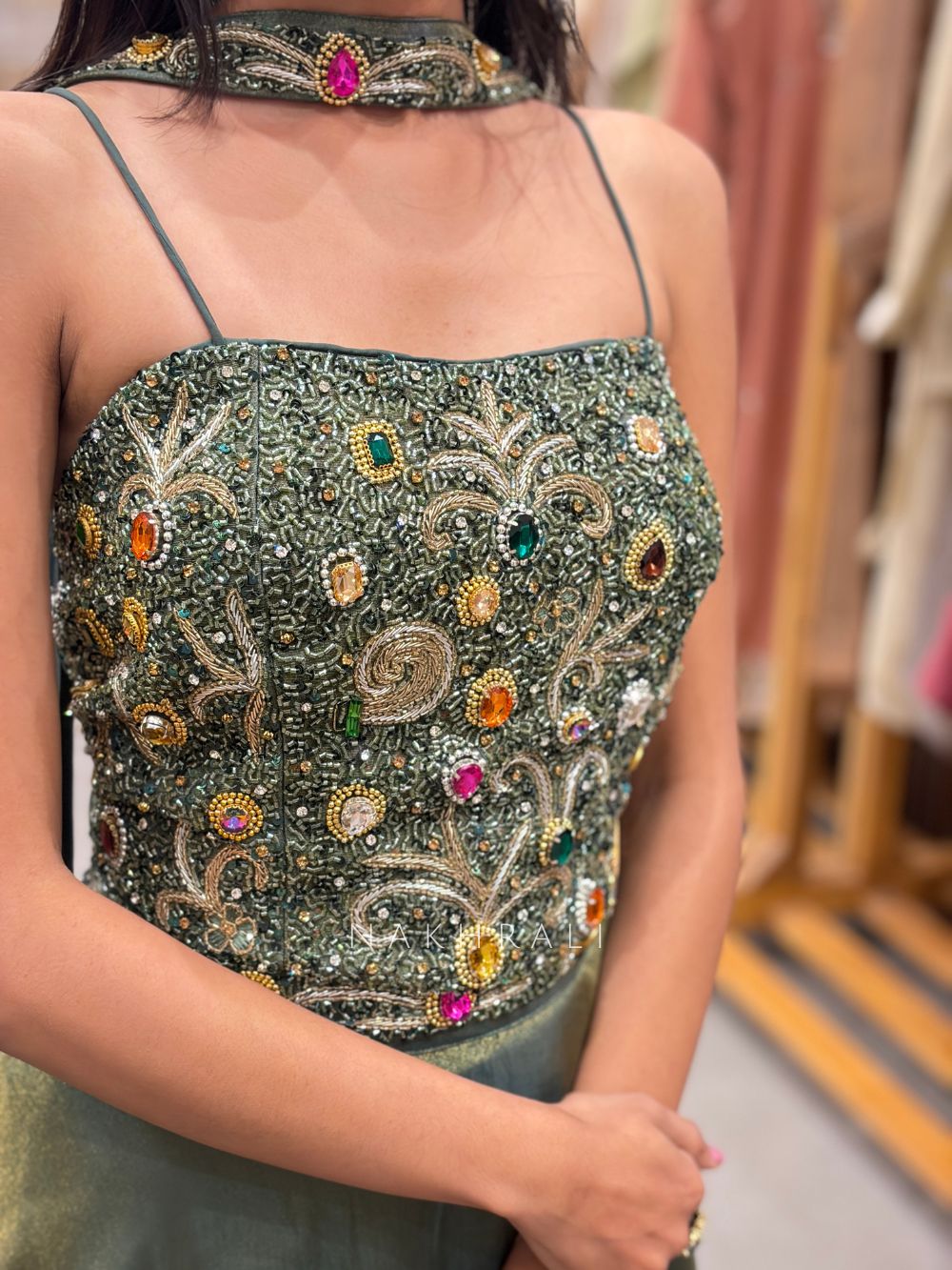This striking indo-western lehenga set blends contemporary elegance with festive glamour. The structured bodice is richly adorned with intricate cut dana and stone embellishments arranged in ornate patterns that create a dazzling textured surface. The delicate straps and statement neckline enhance the modern silhouette while the coordinated choker-style detail adds a dramatic finish. The flowing lehenga skirt brings graceful movement and balances the heavily embellished bodice beautifully. Designed for cocktail celebrations, sangeet nights and grand evening occasions, this ensemble delivers a bold yet refined statement.