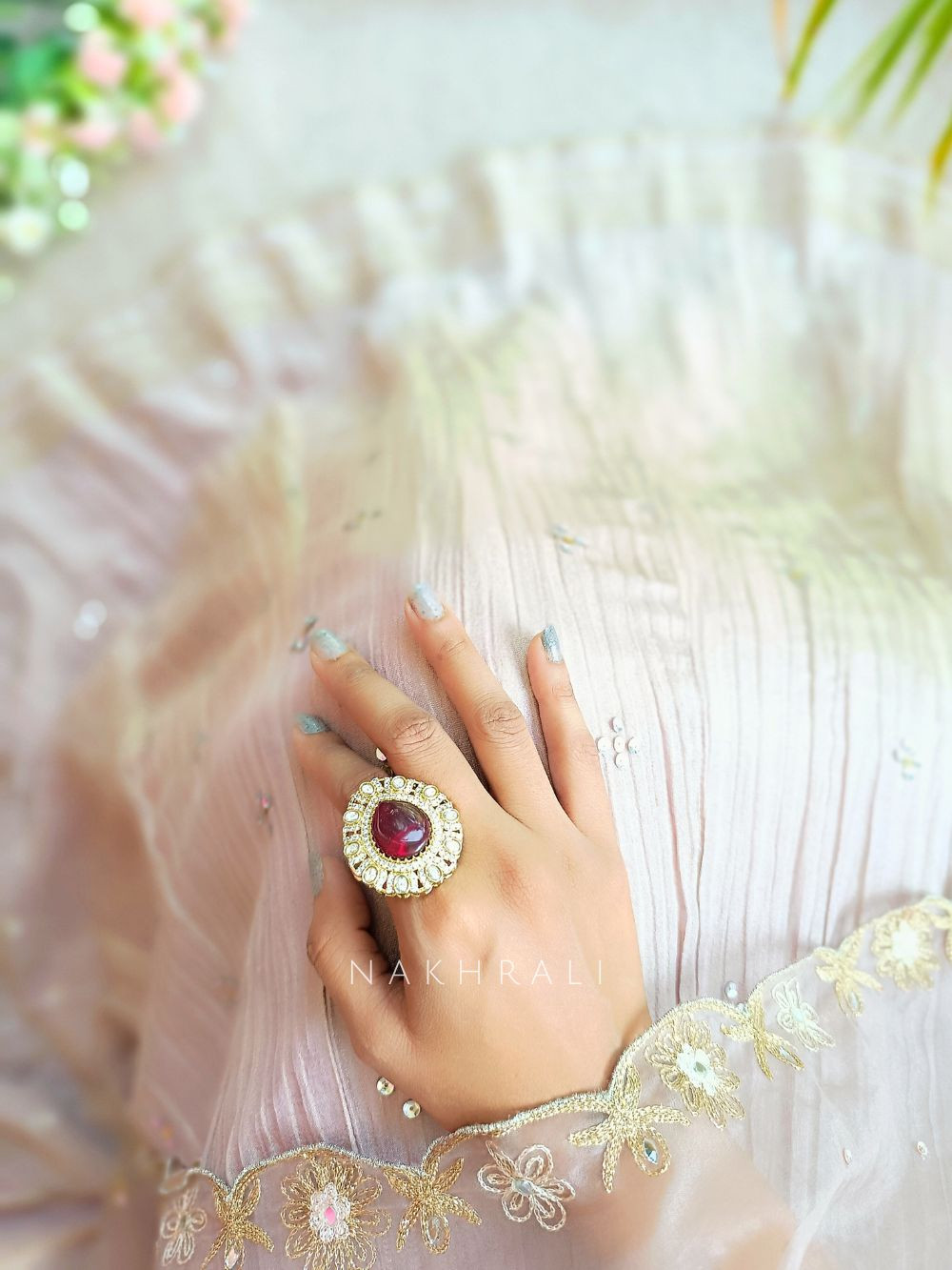 The Vaanya Kundan Royale Ring is a timeless statement piece crafted with bold colored stones in red and green variants, beautifully framed in fine kundan work. Its regal design makes it a versatile jewel—perfect to elevate festive attire, wedding ensembles, or evening gatherings. The intricate detailing and striking hues make this ring a true showstopper, exuding elegance with every wear.