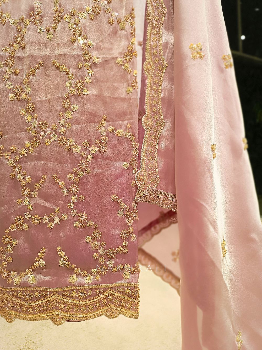 Dry clean only to preserve embroidery. Store wrapped in a muslin cloth. Avoid direct sunlight to maintain fabric sheen. Do not wring or twist the fabric. Iron on low heat with a protective cloth.
