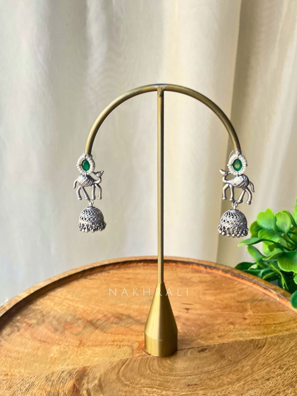 These statement earrings showcase a striking camel motif paired with an emerald-tone stone and finished with intricately detailed jhumka drops. The sculpted design reflects traditional artistry while maintaining a strong, wearable silhouette. Balanced in size yet visually impactful, this pair adds character and depth to ethnic outfits, making it ideal for festive dressing, cultural gatherings, and statement styling moments.