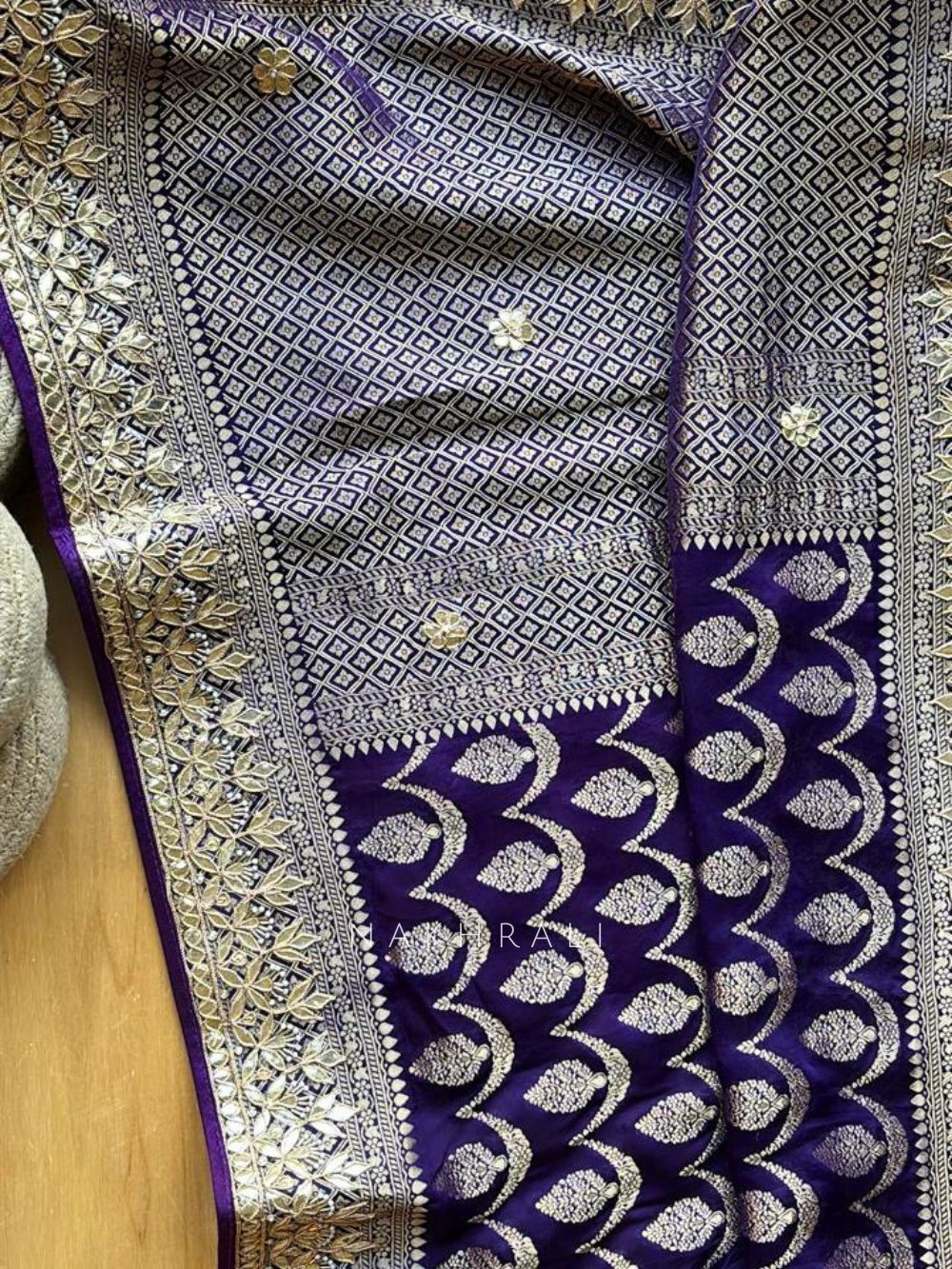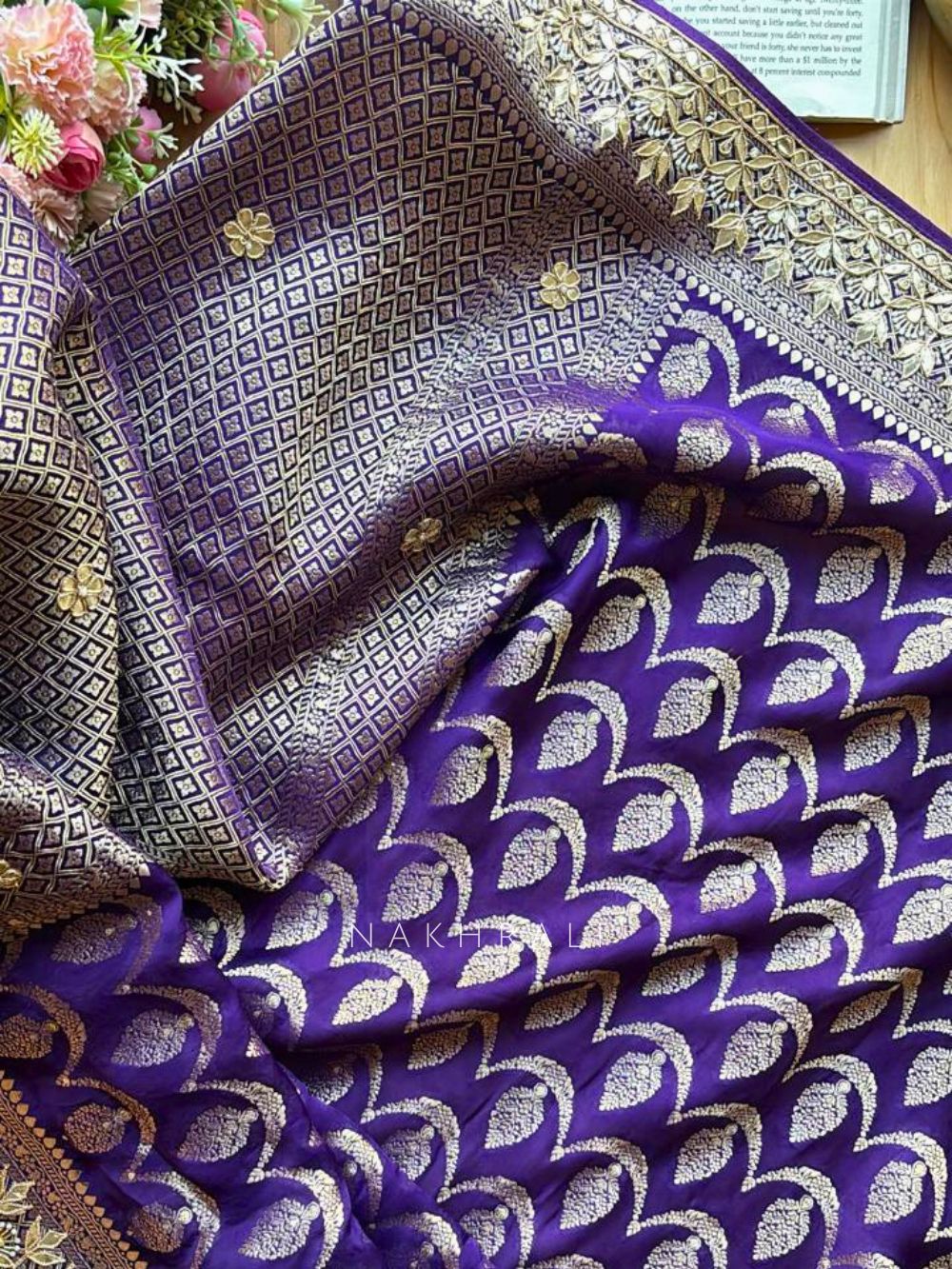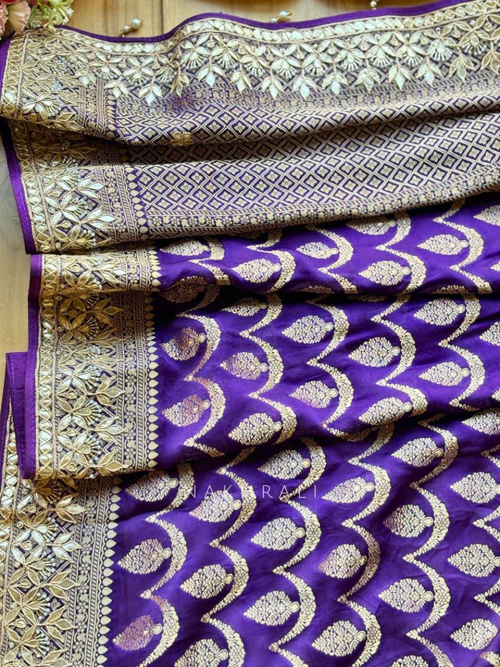 This Banarasi saree is crafted with classic woven motifs that reflect timeless Indian artistry. The fabric carries a rich texture, enhanced with a beautifully detailed gota border that adds festive charm without overpowering the design. It comes with a matching running blouse piece attached to the saree, allowing it to be stitched in the preferred style. Ideal for weddings, festive occasions and traditional celebrations.