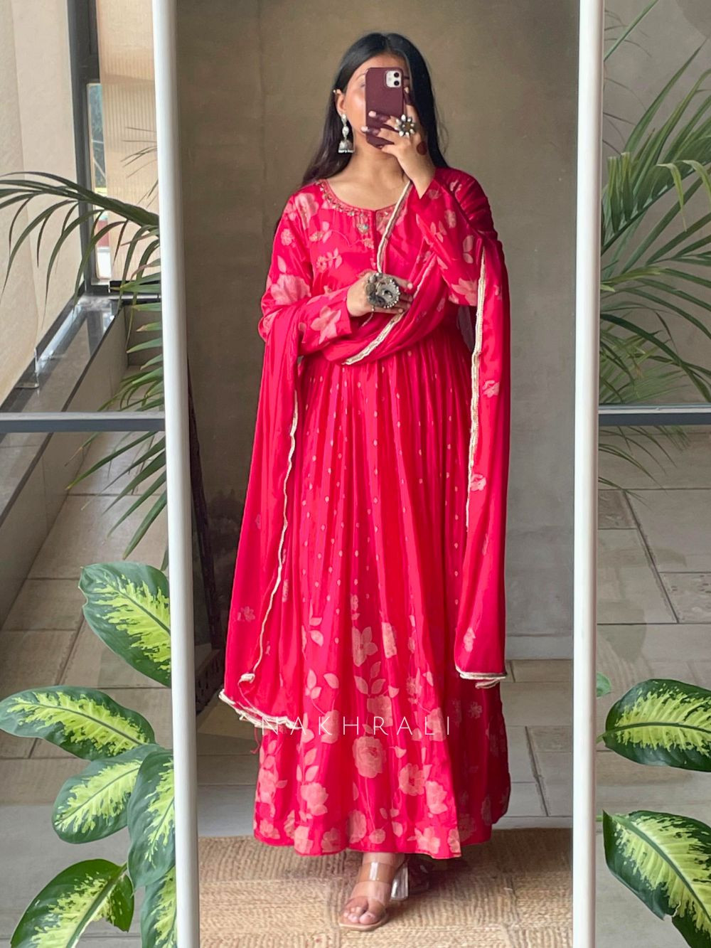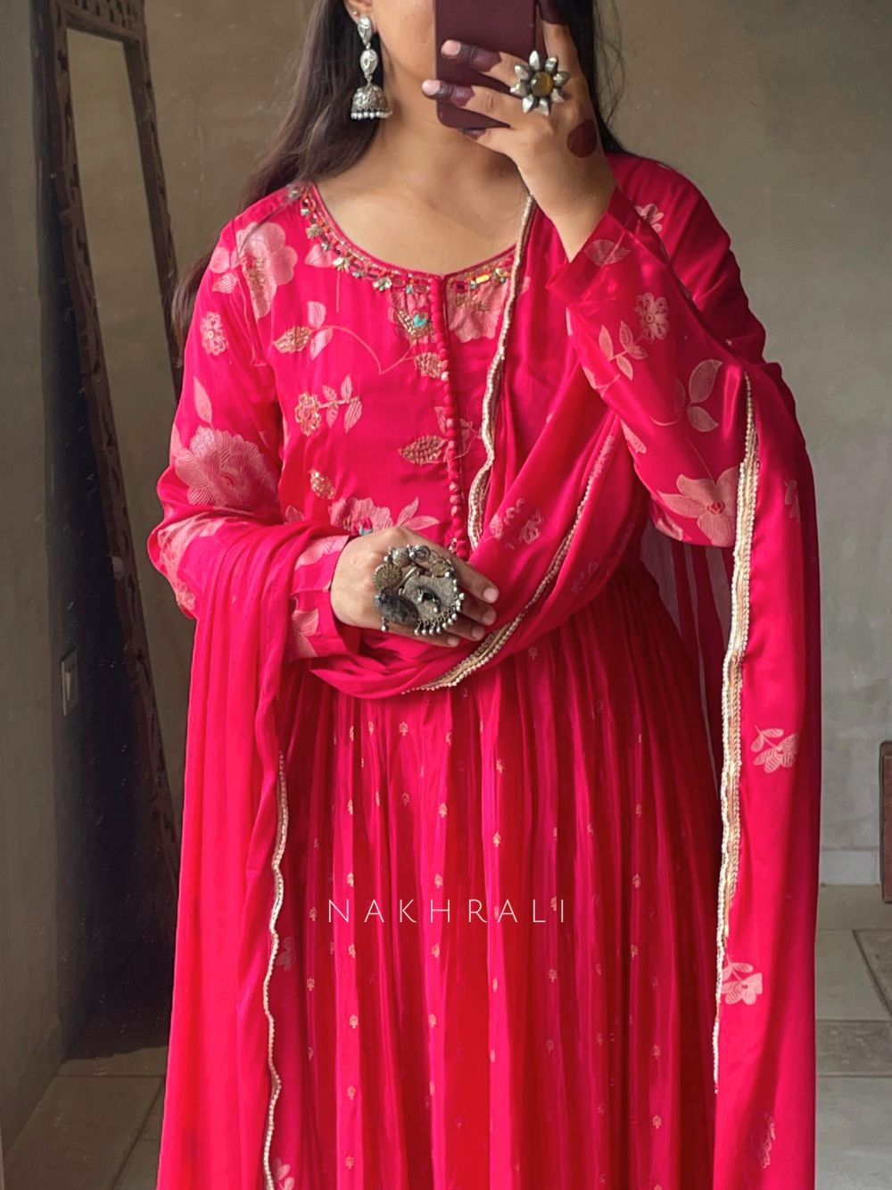 Vashti Magenta Chinon Floral Anarkali with Zari & Bead Work