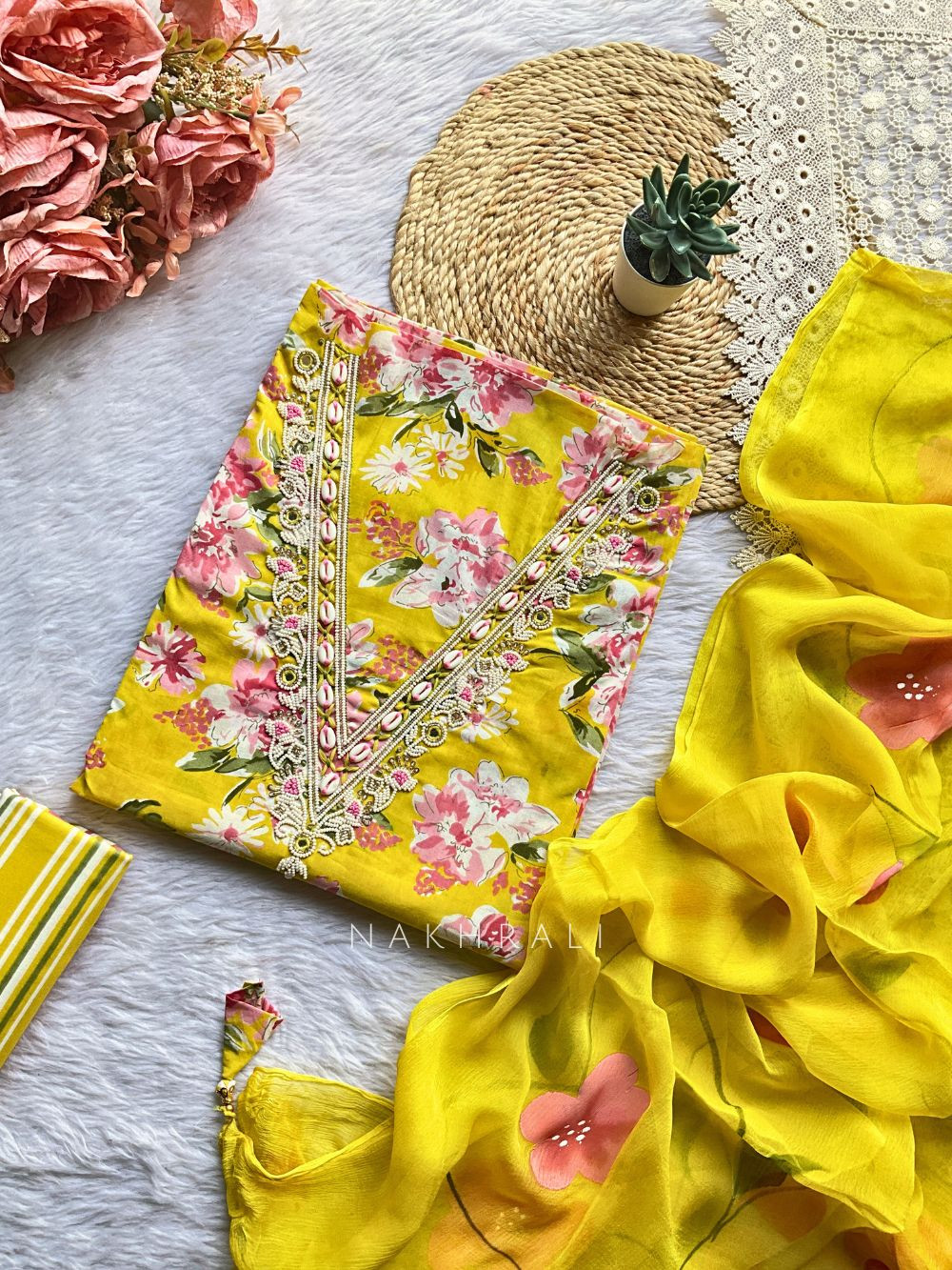 This cotton dress material features an all-over floral print that feels light, feminine, and perfect for everyday elegance. The kurta fabric is highlighted with intricate hand embellishment along the neckline, adding a subtle festive touch without overpowering the look. Paired with a matching cotton bottom and a flowy floral dupatta, this set is ideal for daily wear, casual outings, and relaxed festive days. Comfortable, breathable, and easy to style, it’s designed for effortless ethnic dressing.