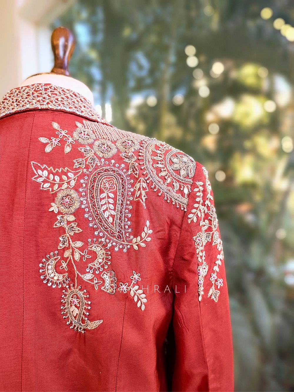 This rust colour crop top skirt set is paired with a beautifully structured jacket adorned with detailed embroidery and fine beadwork, creating a rich handcrafted look. The crop top and flowing skirt balance elegance with modern styling, while the embroidered jacket adds depth and festive charm. Thoughtfully designed for celebrations, evening functions, and wedding festivities, this set stands out for its graceful silhouette and intricate surface detailing without feeling heavy or overdone.