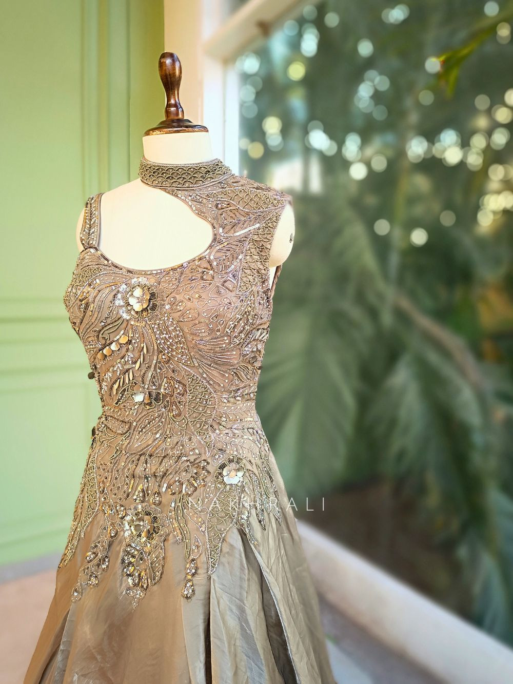 Elowen is crafted for women who want refined glamour without excess. This olive indowestern gown features dense hand embroidery using sequins, beads and cut dana, forming graceful motifs across the bodice and flowing down the skirt. The asymmetric neckline with a choker-style collar adds a contemporary edge, while the fitted bodice transitions into a softly flared skirt that moves beautifully with every step. Balanced in shine and structure, this gown is ideal for cocktail nights, festive evenings and modern wedding functions where understated luxury is key.