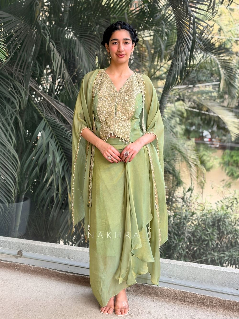 The Verdant Glow Mirror Cape Set is designed for understated glamour with a modern festive sensibility. The fitted top is adorned with detailed mirror embellishment that adds soft shine without overwhelming the look. The flowing skirt complements the structure of the top, creating graceful movement and balance. Completing the ensemble is a sheer cape that drapes beautifully over the shoulders, adding elegance and fluidity to the silhouette. Ideal for intimate celebrations, festive gatherings, and daytime wedding events, this set blends comfort with refined detailing.