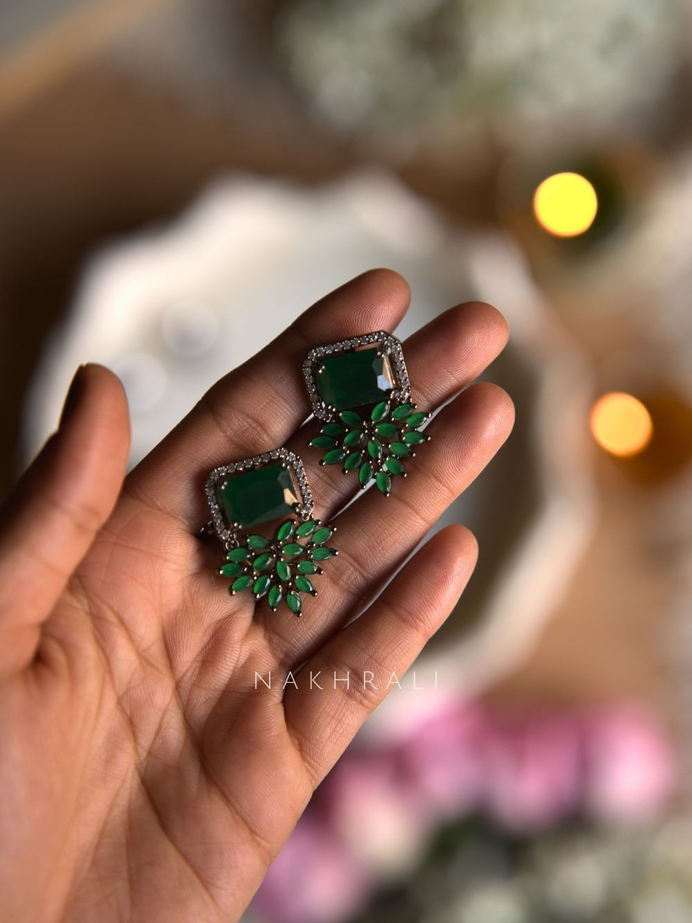These statement earrings are crafted with a structured square-cut centerpiece framed by fine crystal accents, flowing into a floral-inspired cluster that adds movement and depth. The balanced design blends sharp geometry with soft petal-like detailing, making them eye-catching yet wearable. Available in three colour options, these earrings work beautifully with ethnic wear as well as contemporary outfits, offering versatility for festive occasions, celebrations, and evening gatherings.