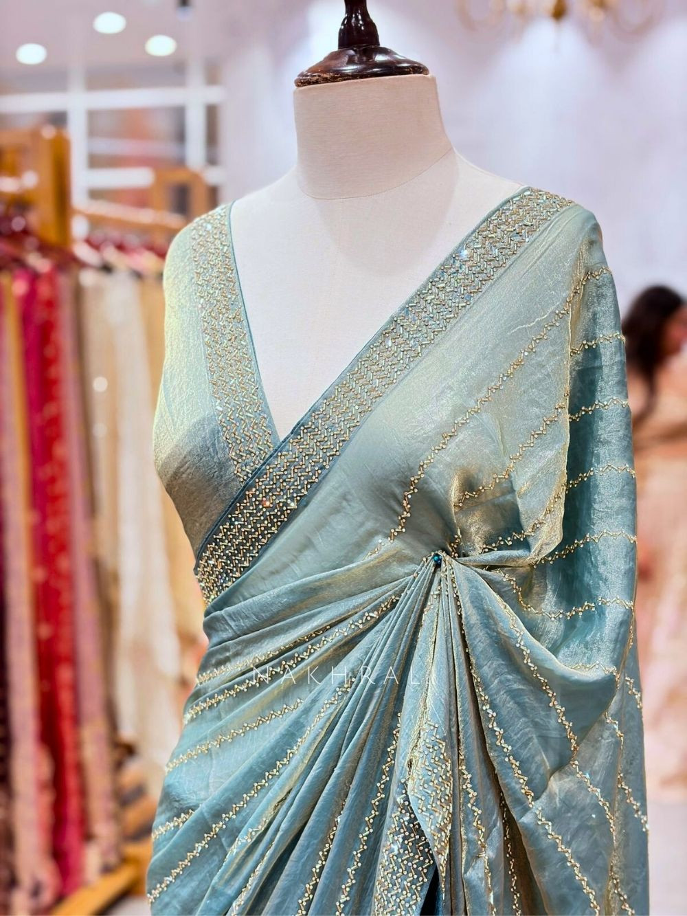 This exquisite tissue saree features a refined shimmer and a beautifully fluid drape, enhanced with detailed cut dana and stone work arranged in delicate linear patterns. The handcrafted edging adds richness without overpowering the look, making it ideal for festive events, weddings, and evening celebrations. Lightweight yet opulent, it blends elegance with ease of wear. Comes with a matching unstitched blouse for custom tailoring.
