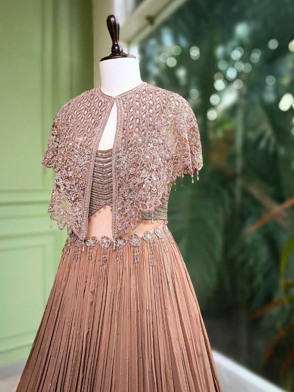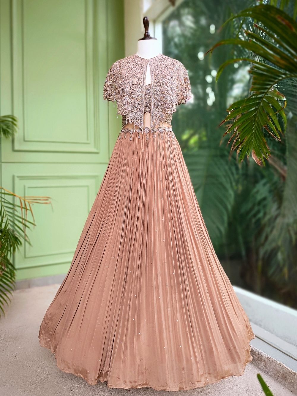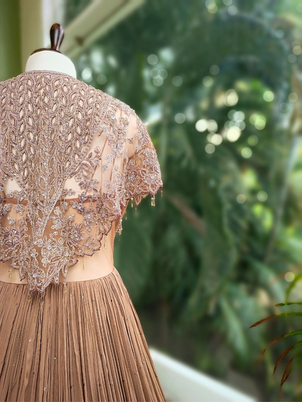 Elevate your occasion wear with the Evelyn Brown Embroidered Gown with Cape Jacket. Designed in a rich brown tone, this gown features delicate sequin and bead embroidery that adds a glamorous sheen to its flowing silhouette. The detachable cape jacket enhances its versatility, offering two equally elegant looks—one with a majestic cape for a dramatic entrance, and one with a sleek gown for a refined finish. Perfect for weddings, receptions, and cocktail evenings, this gown effortlessly blends contemporary sophistication with timeless charm.