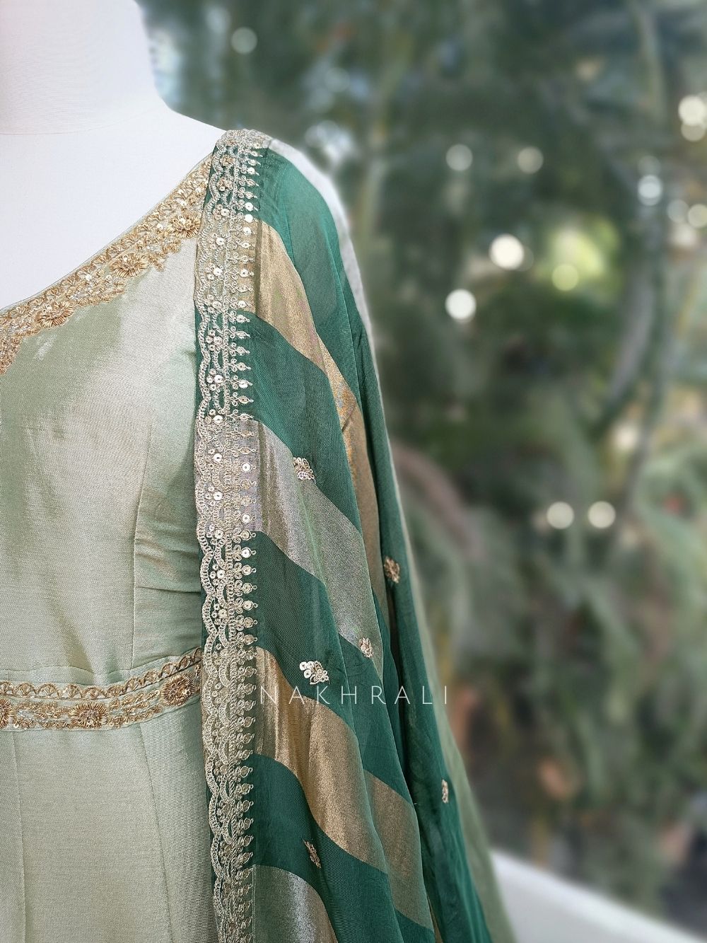 Designed in a flowing Anarkali silhouette, this party wear suit set features a flattering V-neckline and half sleeves detailed with intricate zari and sequin embellishments. The fitted bodice flows into a voluminous flare, accentuated with a subtle embroidered waist belt detail. It is paired with a contrasting striped dupatta finished with delicate border work and scattered motifs, making it ideal for festive gatherings, engagement ceremonies, and evening celebrations.