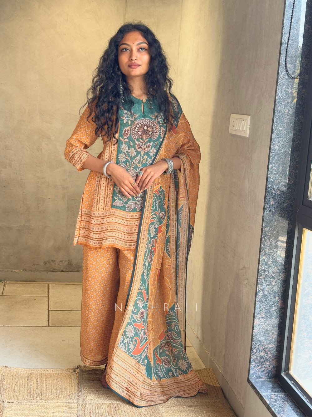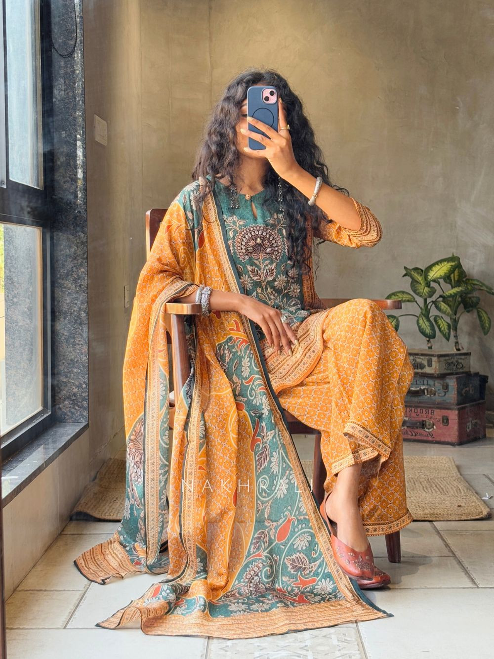 This suit set is designed for women who want comfort without looking basic. The kurta features detailed folk-inspired motifs with a neatly finished neckline and coordinated sleeve borders, creating a clean, premium look. It comes with a matching bottom that keeps the outfit easy to wear and easy to style. The dupatta adds the real drama—rich artwork placement and contrast borders that elevate the set instantly. Wear it for workdays, brunch plans, family get-togethers, and relaxed festive moments when you want compliments without trying too hard.